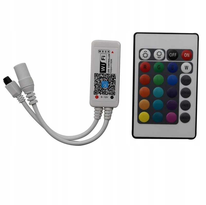 - Функції контролера: вибір кольору, дин. режими, затемнення, освітлення, увімкнення, вимкнення, музичний режим, окреме керування білим кольором