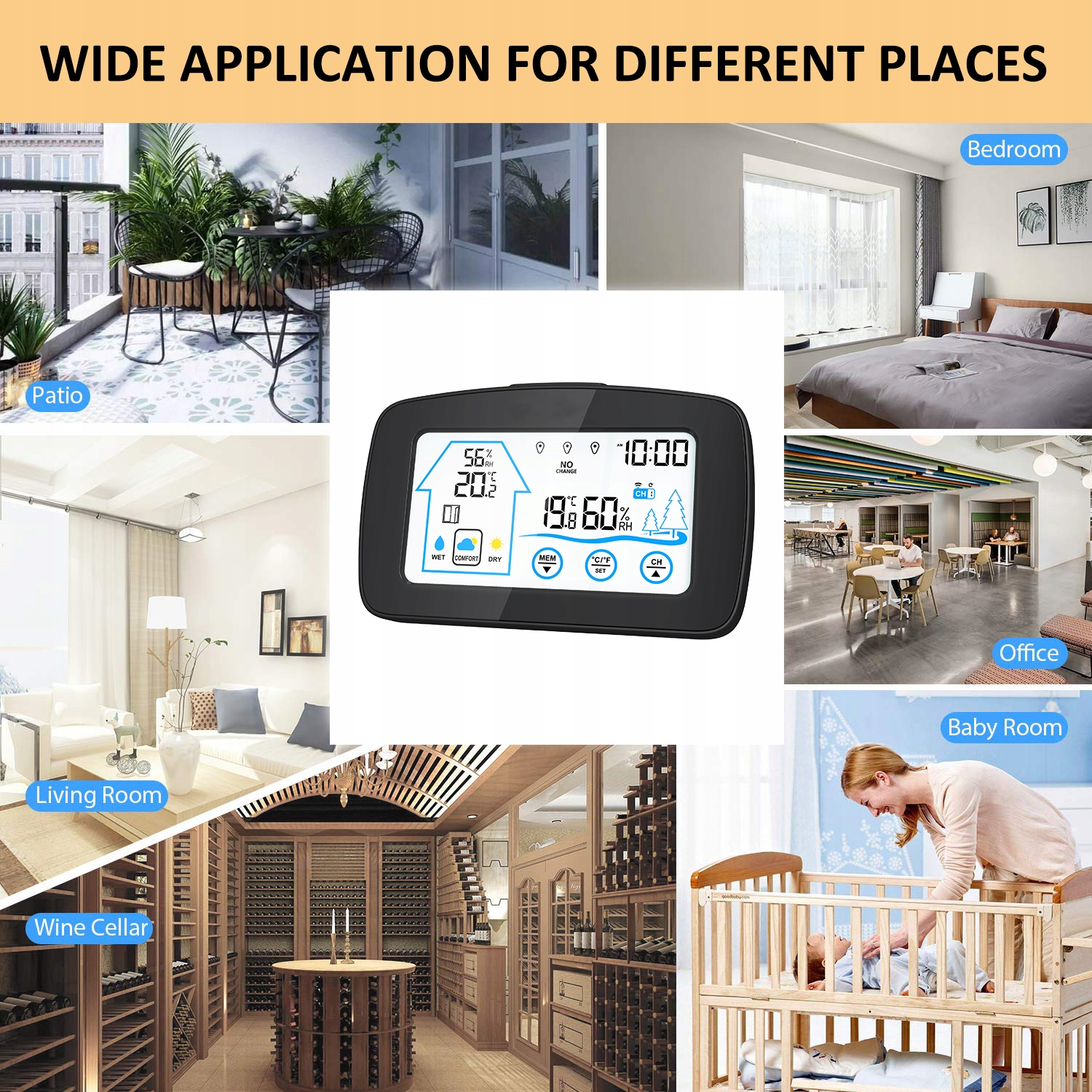 - [сенсорний екран] Температура та волога цифрового кольору всередині/зовні, час, індикатор комфорту, нагадування про вікно відкритого/закриття, що вказує на тенденцію вологості та багатьох інших.