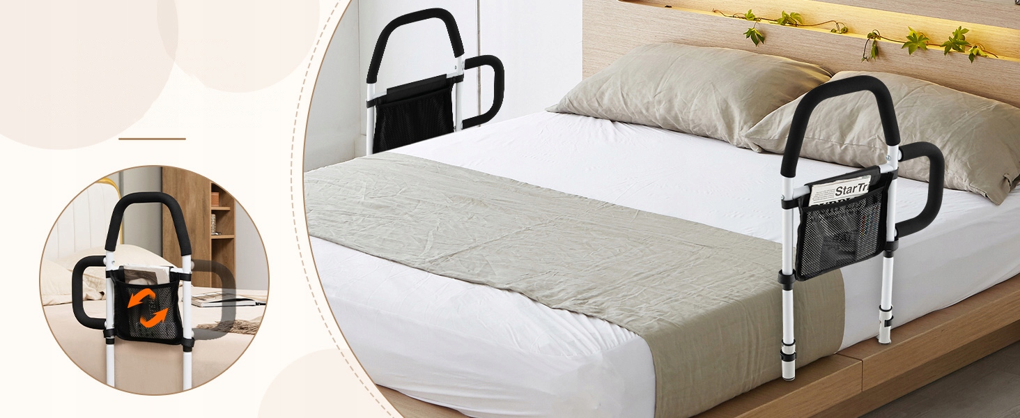 🛡【Зручна конструкція】Знімна кишеня дозволяє зберігати такі необхідні речі, як окуляри, монітори та матеріали для читання, під рукою. Бічну ручку можна прикріпити до обох боків поручня, що робить поруччя зручним для використання з обох боків ліжка для зручності.