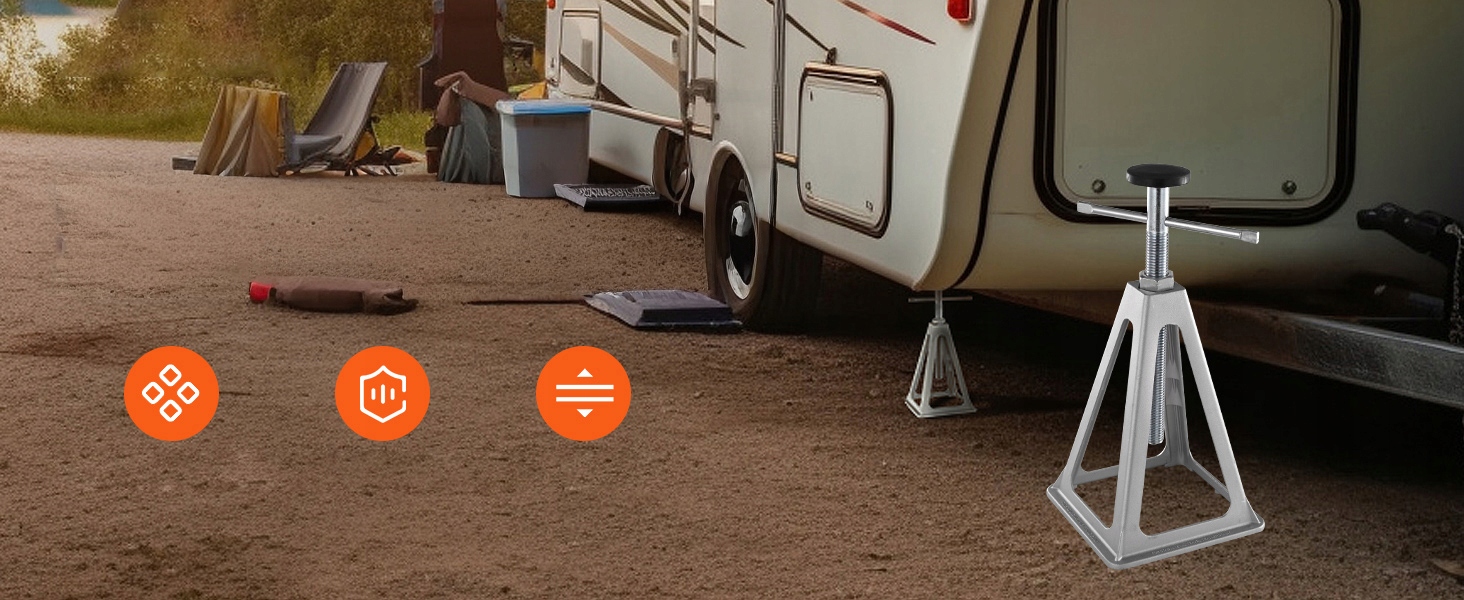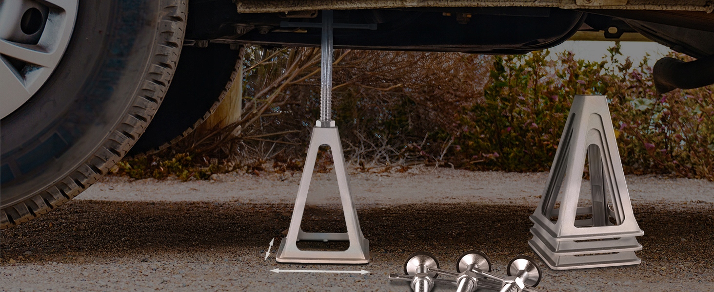 - Стабілізація вашого автофургону: кожен комплект включає чотири домкрати з м’яким гумовим кільцем угорі. Один домкрат витримує до 6,72 тонни. Трикутна опорна структура забезпечує міцну стійкість. Ці вирівнювальні домкрати можна легко встановити під ваш автомобіль для безпечної та стабільної роботи. Попрощайтеся з проблемами нестабільності. з нашими гніздами стабілізатора RV.