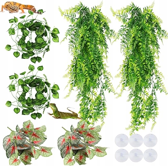 - Набір включає: 2 x джунглі рептилії ліана з листям, 2 x великі пластикові підвісні листя лози, 2 x міні-підвісні рослини плюща, 6 x присосок чашки.