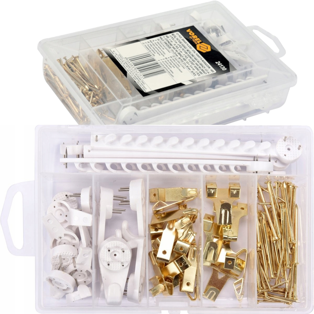 Набір із 121 предмета VOREL, який міститьрізні типи гачків і цвяхів.