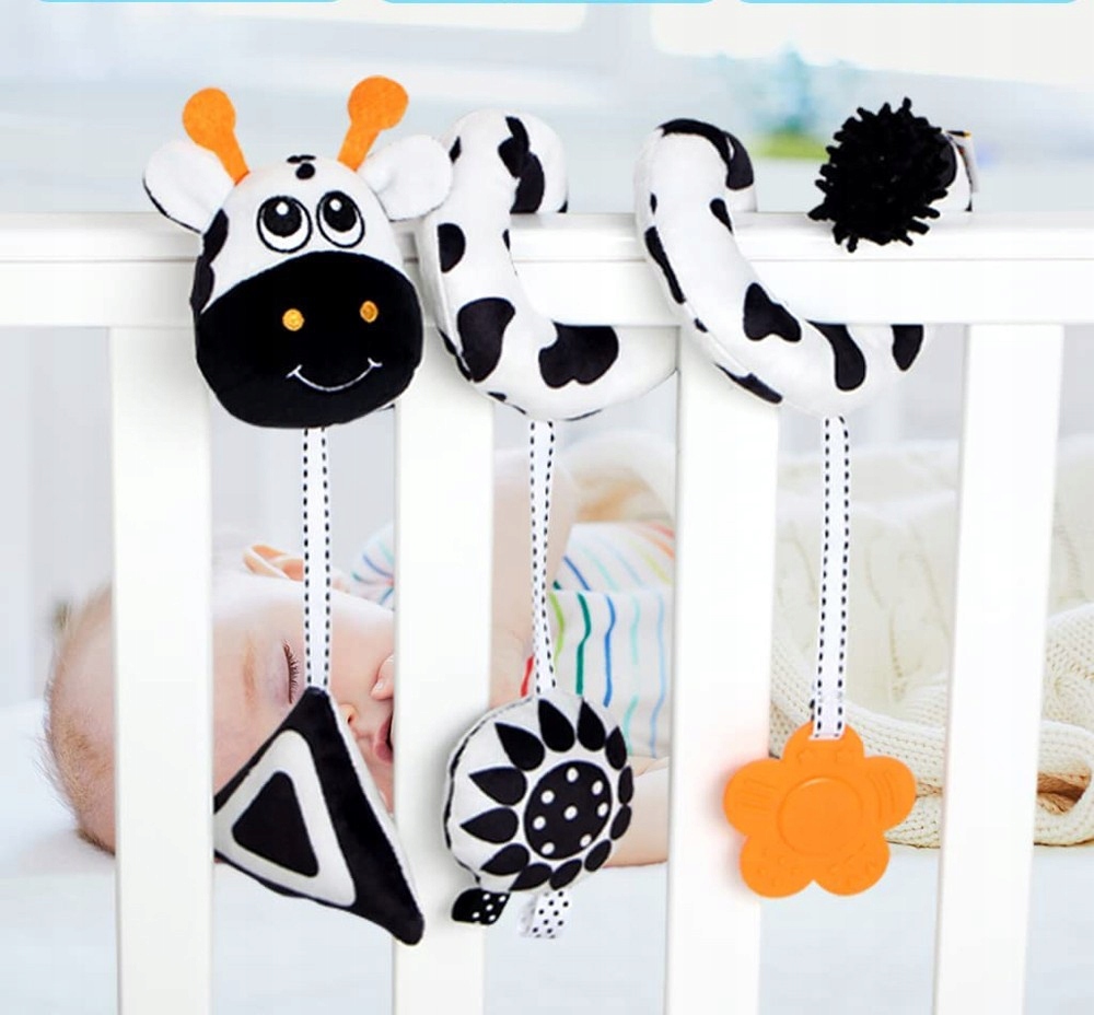 підвіски з різними геометричними фігурами побудували -в шелест, скрипучі елементи та тейтер, які я даю можливість грати в різних напрямках і що іграшка не швидко отримає . Спіраль легкий на дотик її можна легко промивати, коли вам це потрібно.