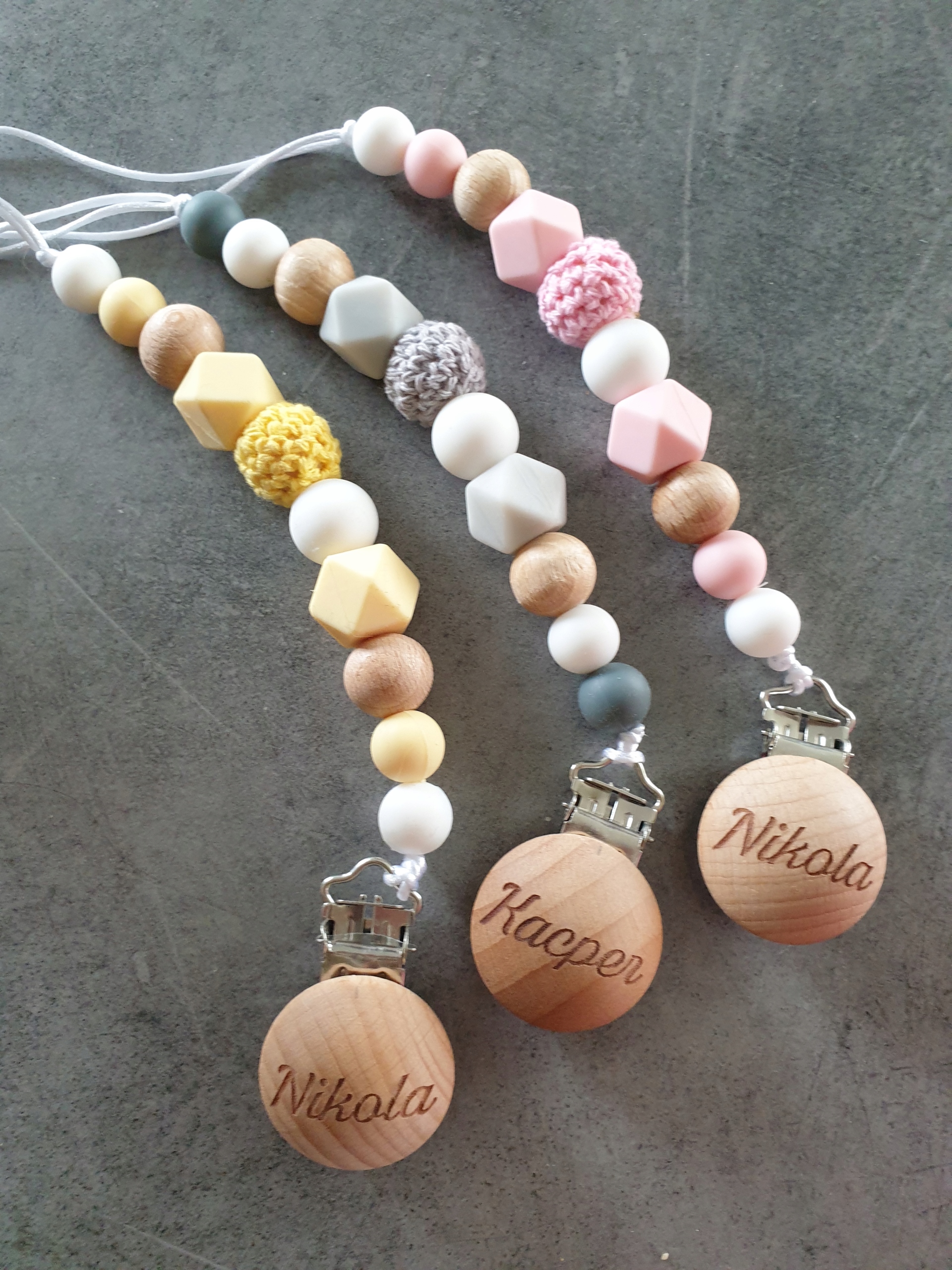 Дерев'яні та силіконові брелоки для пустушок, з назвою або будь-яким текстом.