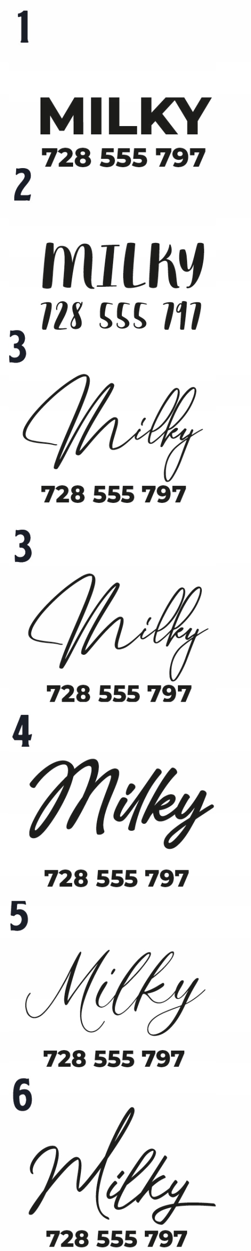 Наприклад: шрифт 3, вміст : Milky 728 555 797
