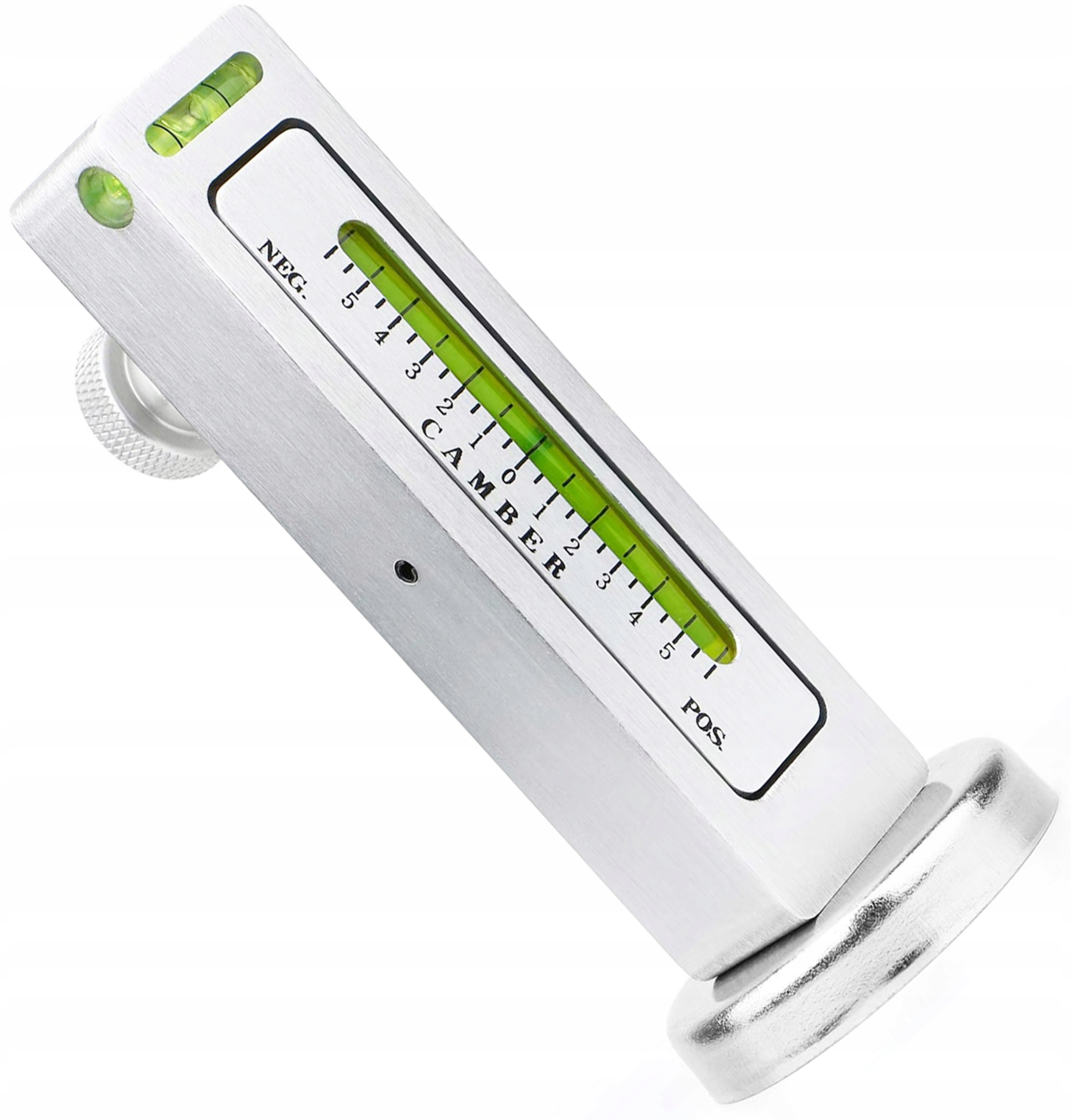 пристрій дозволяє вимірювати кут нахилу колеса та кут повороту цапфи. Це особливо важливо під час ремонту, пов'язаного із заміною амортизаторів або інших деталей, що впливають на геометрію коліс. Пристрій кріпиться безпосередньо на ступицю або гальмівні диски за допомогою магнітного тримача. Він оснащений гвинтом і шкалою від -3 до +3 градусів. - Упаковка - пластикова касета.