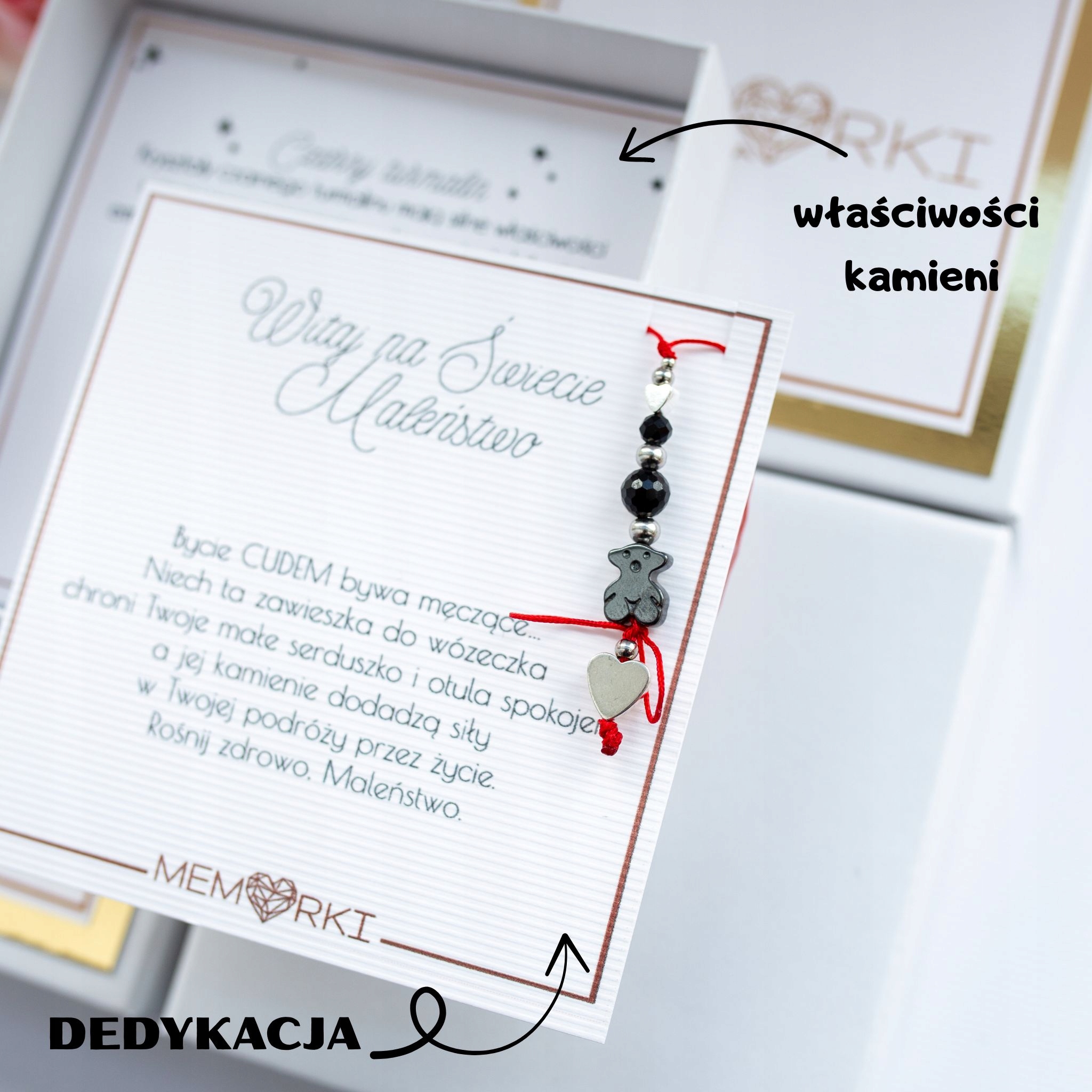 Натуральне каміння, складно нанизане на червоний ювелірний шнурок, у поєднанні з гематитовим плюшевим ведмедиком ідеально підійде практично до будь-якого стилю, додаючи шарму та вишуканості, а червоний Посилаючись на традицію, струна захистить дитина від привороту.