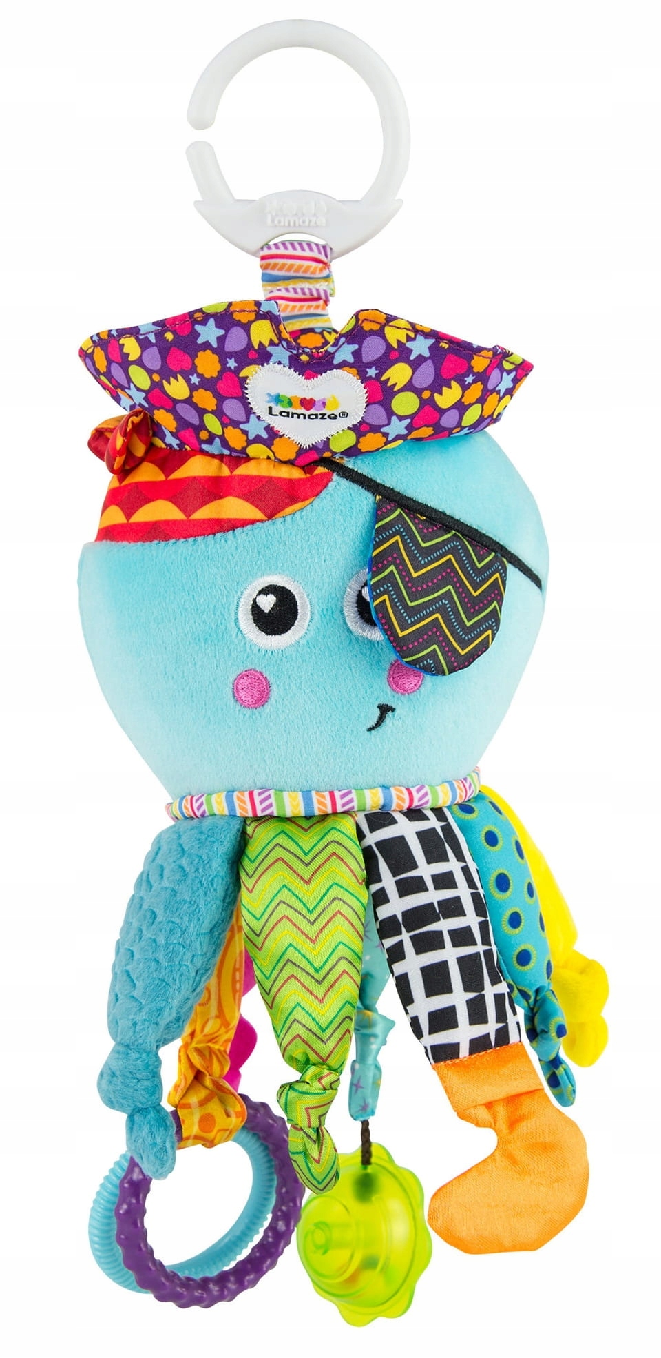 Підвіска Captain Calamari виготовлена з матеріалів з цікавою структурою та має багато різноманітних елементів та навчальних функцій. Основні принади іграшки: кожна друга рука восьминога і капелюшок мають шурхітливі елементи і безпечне дзеркальце внизу, додаткові елементи, прикріплені до щупалець: брязкальце з різнокольоровими намистинками і кільцями, які виконують роль прорізувача.