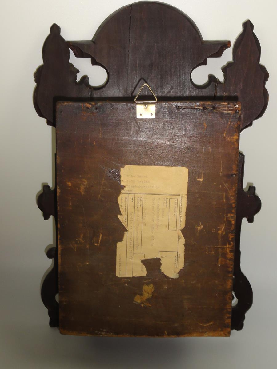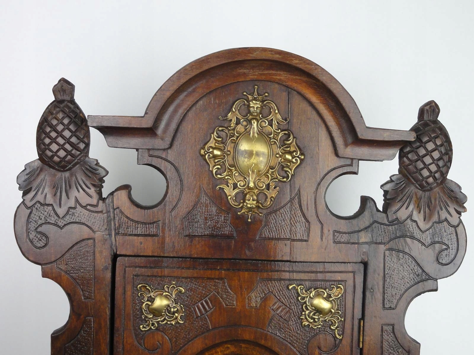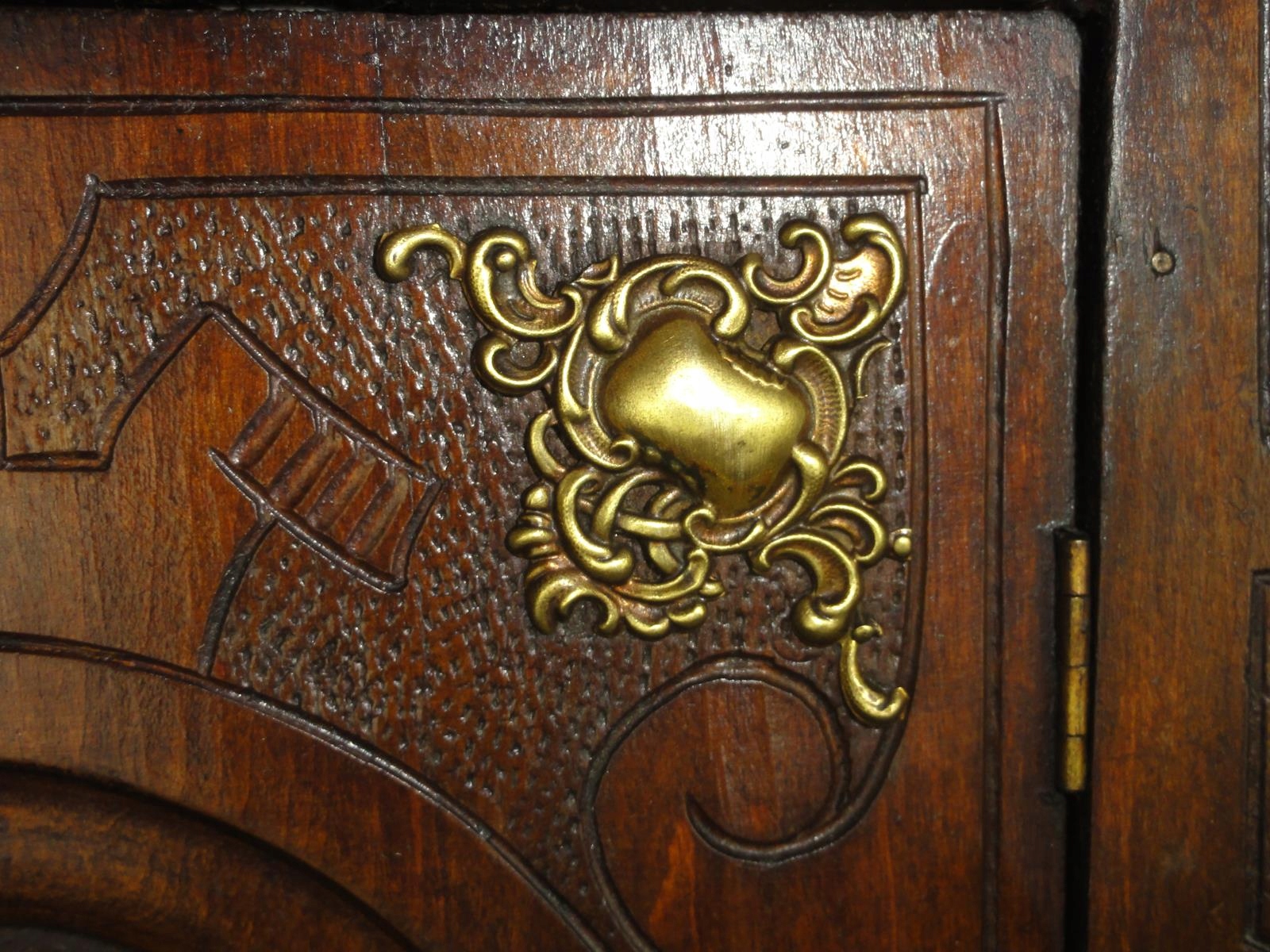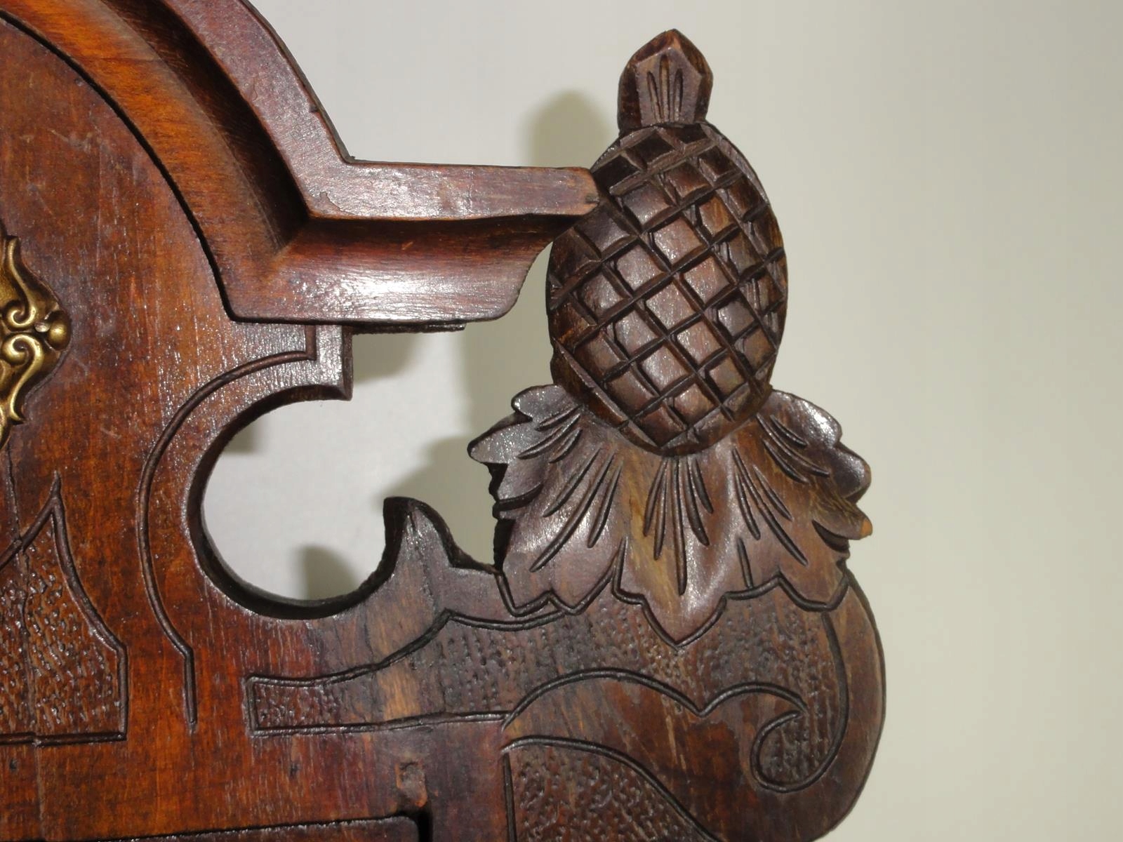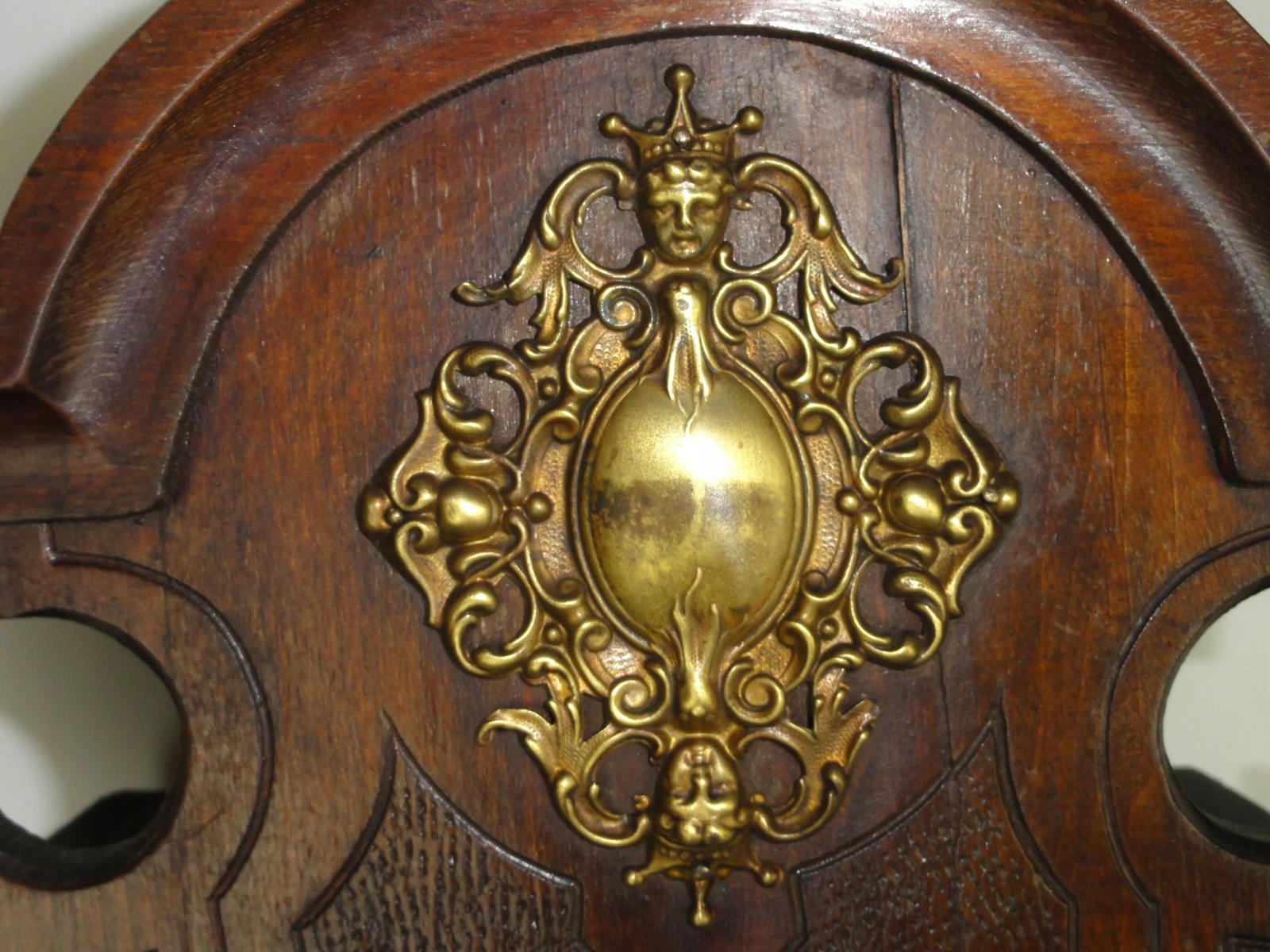 *виготовлена з деревини твердих порід рубежу 19-20 століть, прикрашена різьбленням та аплікаціями з латуні,