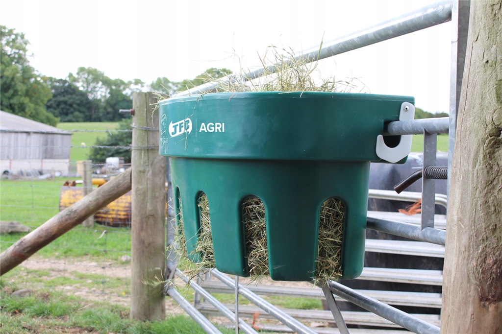 Годівниця має два міцних гачки, які дозволяють повісити її на ворота, перила або паркан. Ідеально підходить для використання з телятником JFC, висить на огорожі.