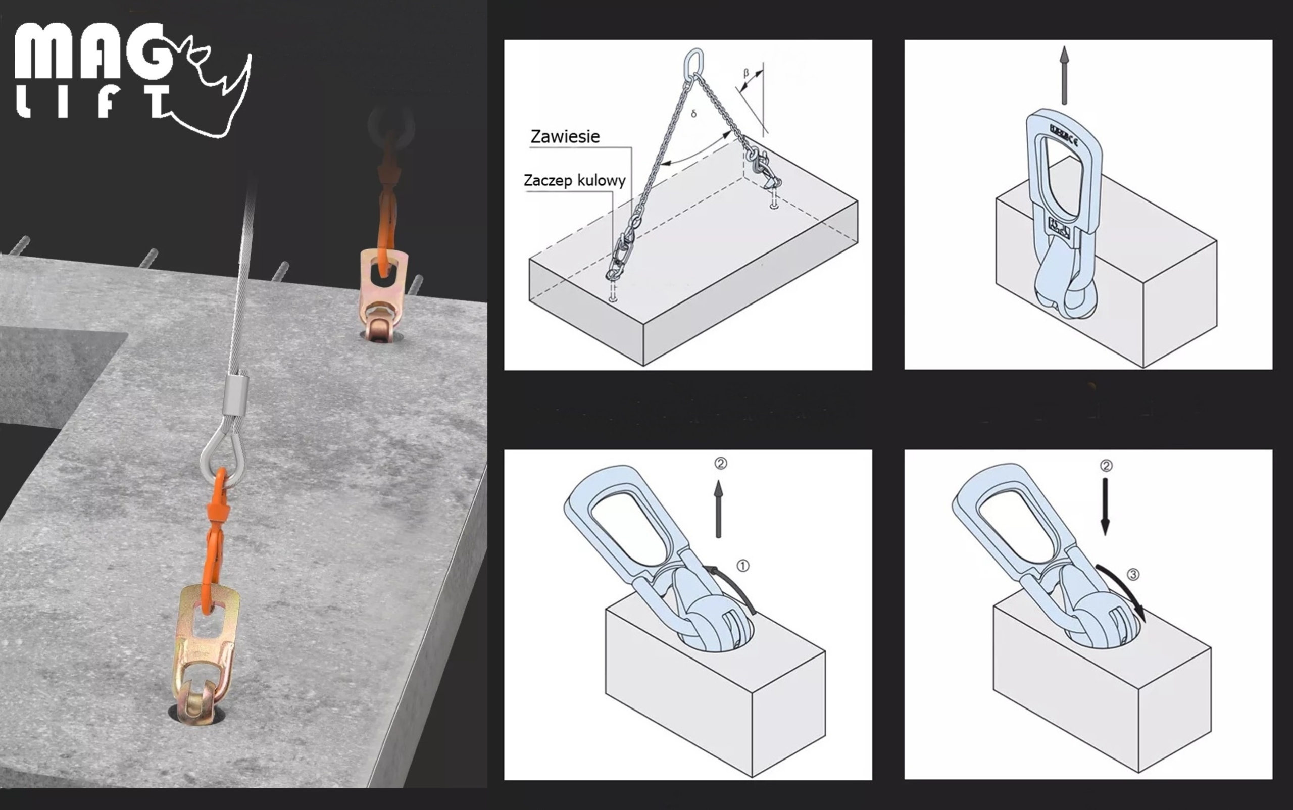ЗАСТОСУВАННЯ: Для підйому збірних бетонних конструкцій, виробничої та будівельної промисловості та інших пов’язаних галузей. Вони допомагають у безпечному транспортуванні та розміщенні збірних конструкцій, в яких потрібен підйом збірних елементів, а також інших, таких як: бочки, бетонні блоки, фрагменти бордюрів, рулони, піддони з завантаженням, листи - як у горизонтальному, так і у вертикальному положеннях - сталеві профілі , труби, рейки та всілякі бруски та інші види будівельних матеріалів з повною безпекою. Вони придатні для використання в діапазоні температур від -20°C до 80°C без зниження межі робочого навантаження.