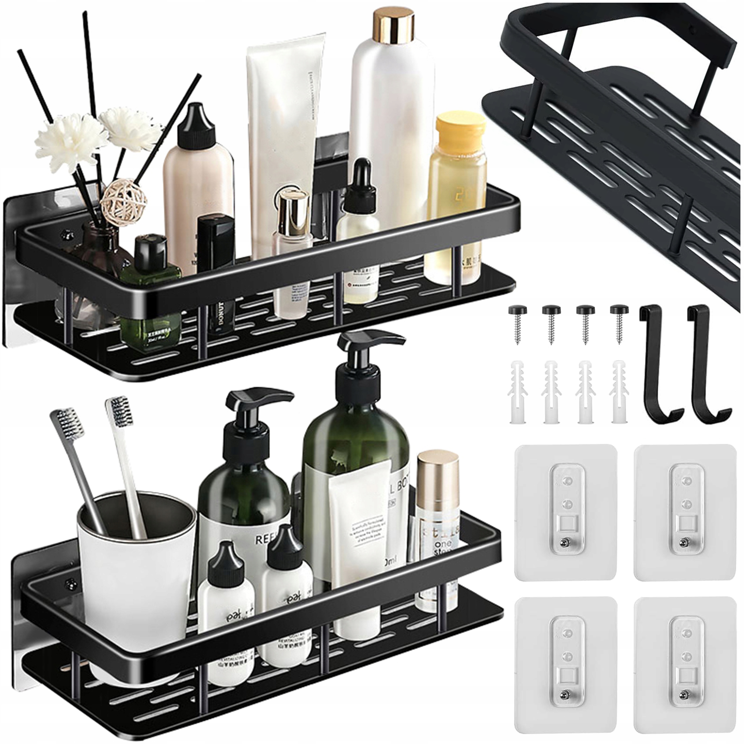 Набір із двох практичних поличок для ванної кімнати з міцного алюмінію. Полиці мають отвори для стоку води, що полегшує утримання в чистоті. Встановлення полиці відбувається швидко та без проблем. Його можна легко повісити на стіну за допомогою дюбелів або спеціального клею, усуваючи необхідність свердлити отвори.