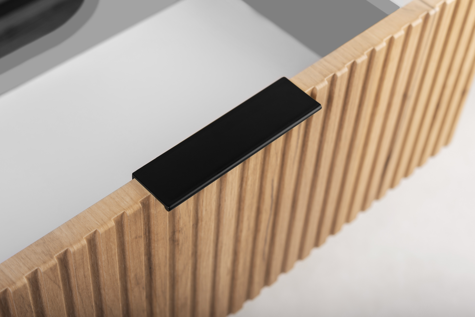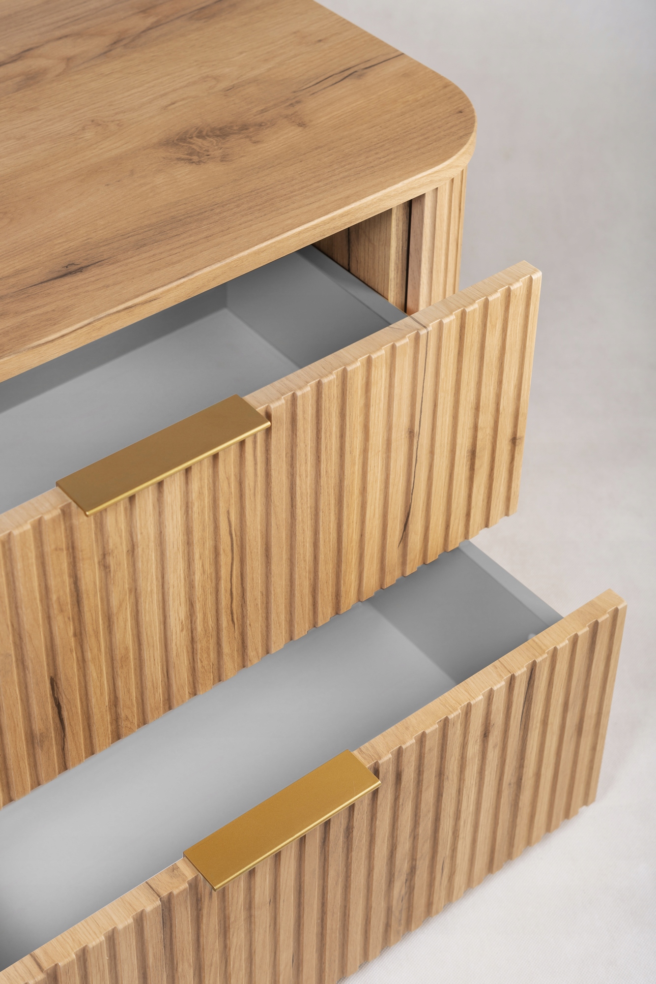 Овальні рифлені фасади з двома місткими ящиками виготовлені з високоякісних плит МДФ, є не лише практичним рішенням, а й естетичним елементом, який привертає увагу. легкість і зробити його справжнім декоративним елементом. Золоті та чорні ручки, що входять до комплекту, становлять елегантний акцент, який надає меблям вишуканого характеру.