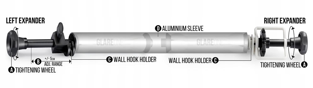 - правильно спланувати відстань між встановленими ручками/гачками на стіні/стелі – бути приблизно на 3-8 см ширшим за рукав із намотаним фоном - лівий розширювач допомагає компенсувати різницю в 5 см у ширині між фоном з розширювачами та настінним кріпленням