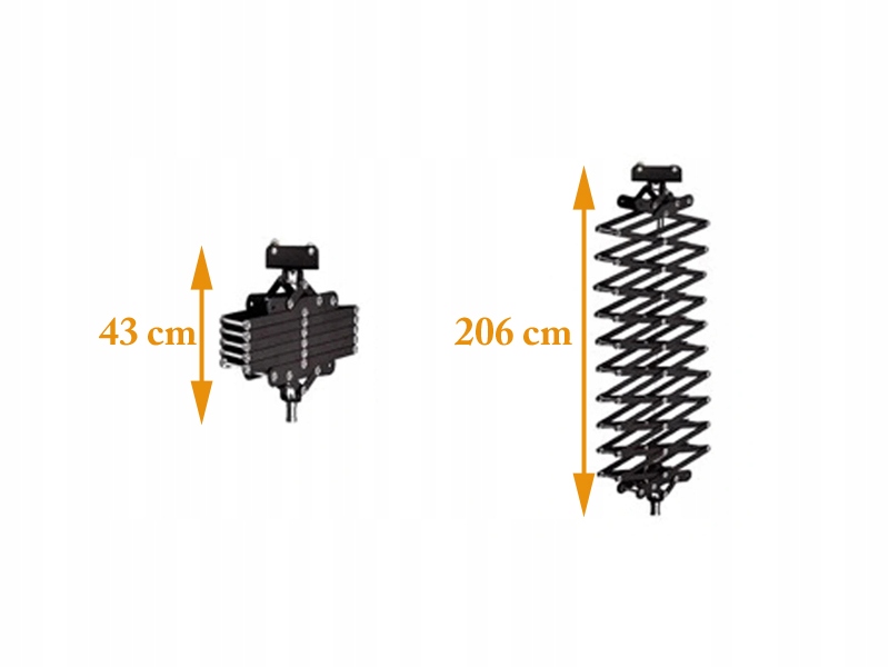 Чотири пантографа на сталевому тросі, з котушкою з плавним регулюванням висунення - від 40 см до 200 см. Котушка має зубчасті краї і собачку - вона фіксується в заданому положенні під вагою лампи. Лампа кріпиться за допомогою подвійної шпильки 16 мм, яка входить в комплект. Пантографи виготовлені з металу, максимальне навантаження на кожен - 15 кг. Це дозволяє монтувати практично всі наявні на ринку лампи разом з будь-якими аксесуарами - софтбокси, косметичні тарілки тощо.