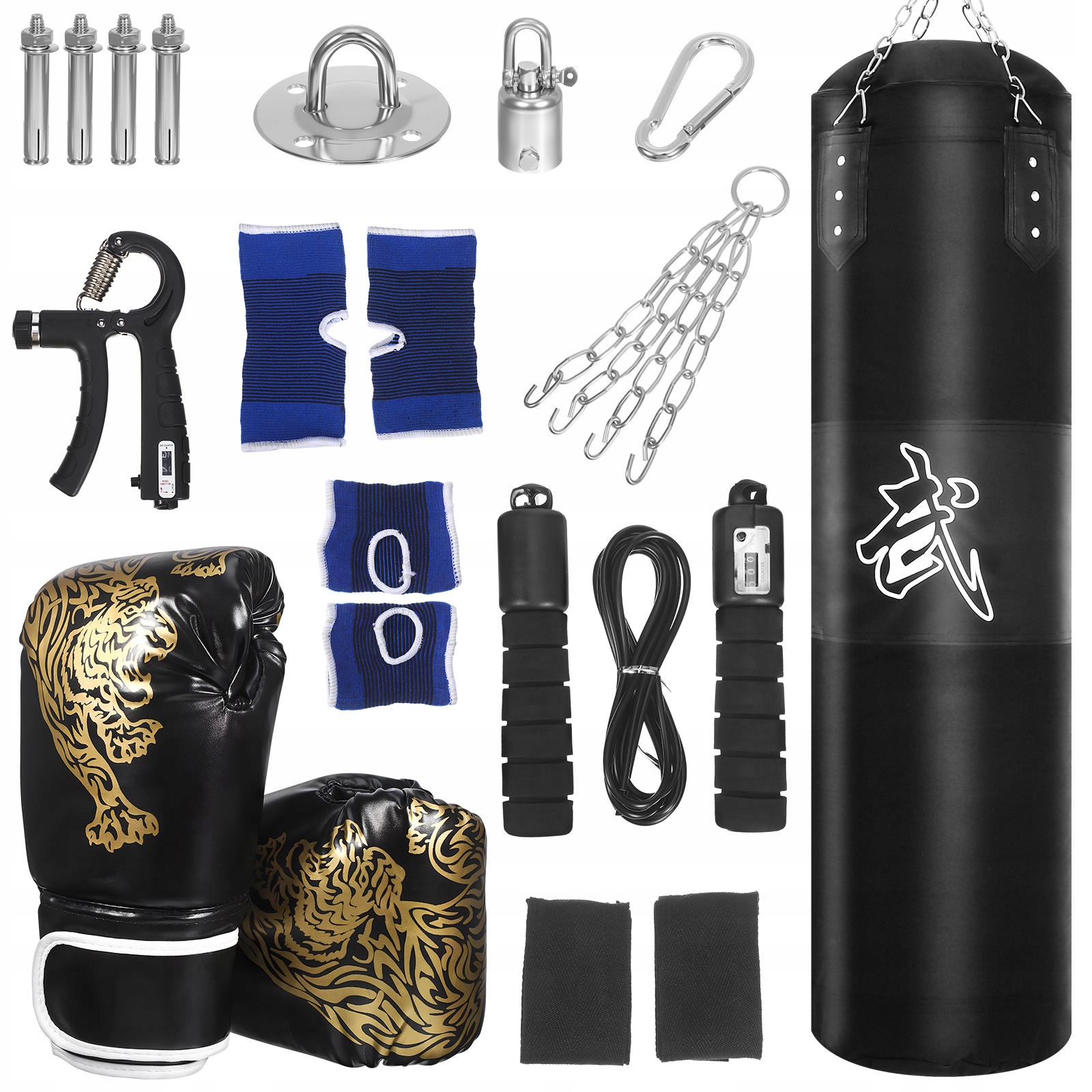 ✅ 1 x мішок з піском, 1 x пара пов’язок для рук, 1 x пара боксерських рукавичок, 1 x скакалка з лічильником, 1 x тренажер для зміцнення рук із лічильником, 1 x пара щитків для рук, 1 x пара щитків для зап’ястя, 1 x пара щитків для ніг, 1 x Опорна пластина для важких навантажень, 4 розширювальні гвинти, 1 затискач, 1 кріпильний ланцюг, 1 х 360°