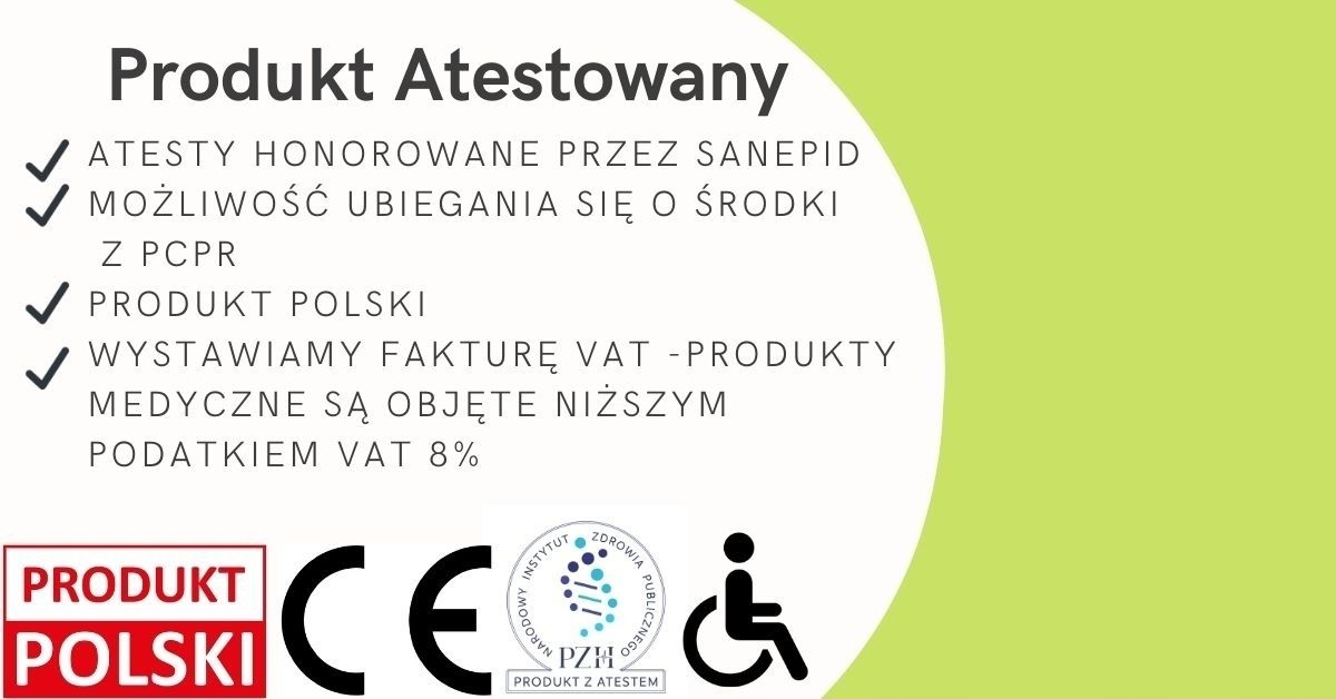 Купуючи нашу продукцію, ви можете подати заявку на повернення коштів від PCPR, оскільки вся продукція відповідає європейським нормам і стандартам усунення бар’єрів для людей з обмеженими можливостями. Вони мають європейське маркування CE та внесені до Реєстру медичних виробів.