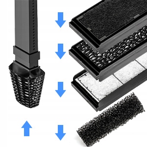 Каскадний фільтр поєднує в собі фільтрацію, стерилізацію, аерацію та видалення жирової мембрани. Каскадна конструкція виходу не тільки красива, але й підвищує вміст кисню в резервуарі, покращуючи умови життя риб і водних рослин.