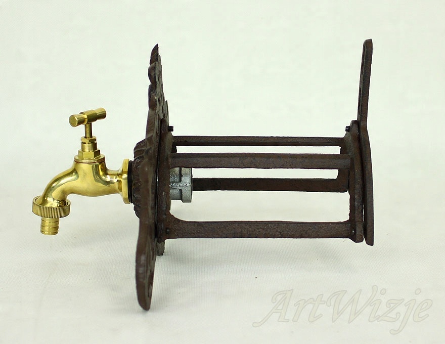 Чавунна ажурна підвіска (тримач) для садового шланга прикрашена рослинним орнаментом. На передній ручці є зручний латунний кран, який дозволяє підключити шланг.