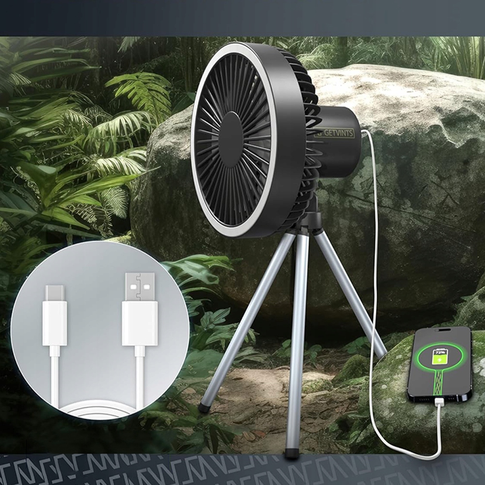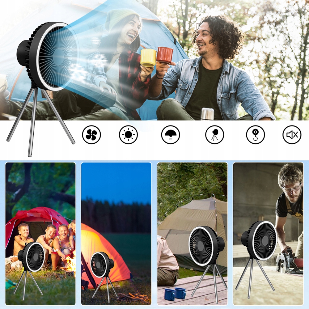 💡 Регульоване освітлення: На додаток до функції вентилятора, він оснащений лампою з трьома рівнями яскравості, що робить його ідеальним джерелом світла на роботі, у кемпінгу, в гаражі чи на балконі.