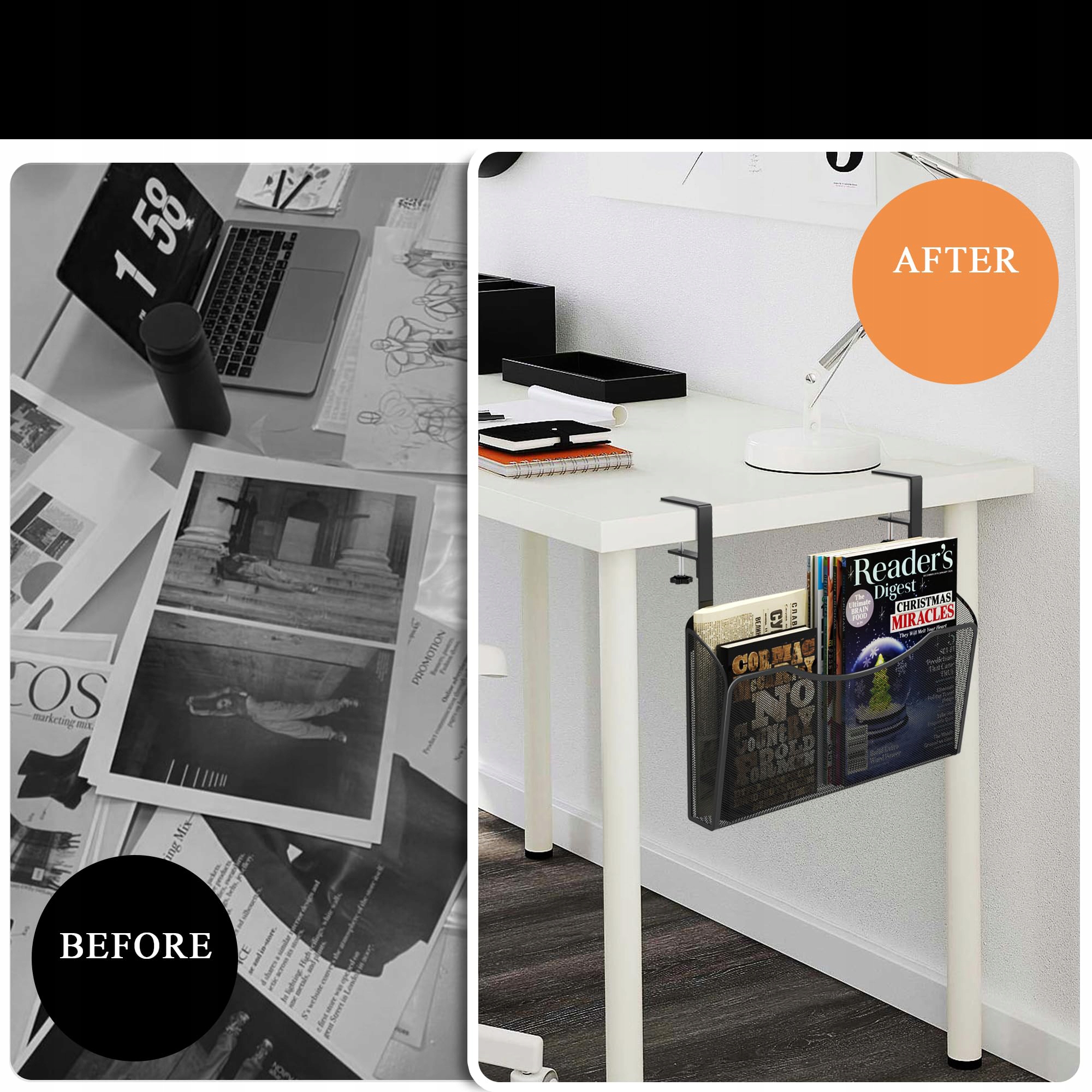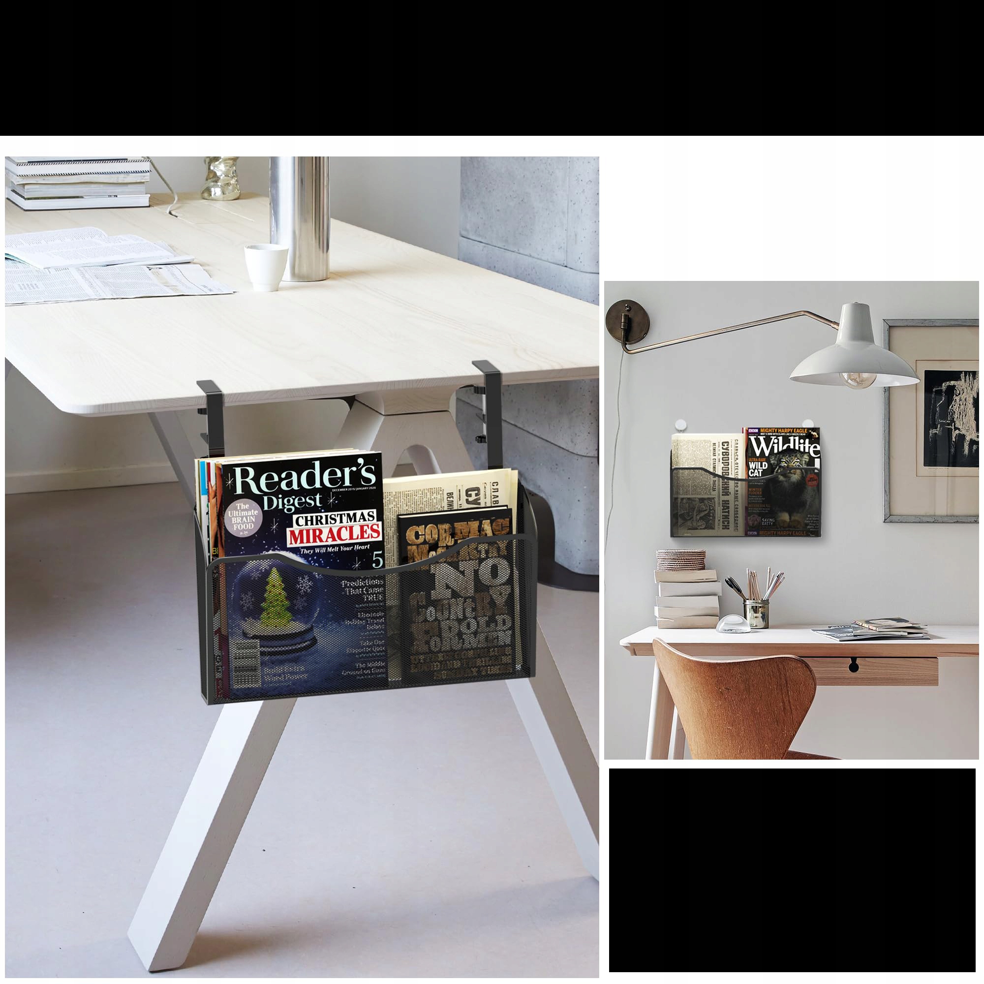 Цей підвісний тримач для документів 2 в 1 є ідеальним рішенням для вашого робочого простору, слугуючи місцем зберігання під столом або настінним підвісним кошиком для журналів. Це комплексне рішення для організації офісу, яке підвищує продуктивність завдяки тому, що всі необхідні речі впорядковані та легкодоступні.