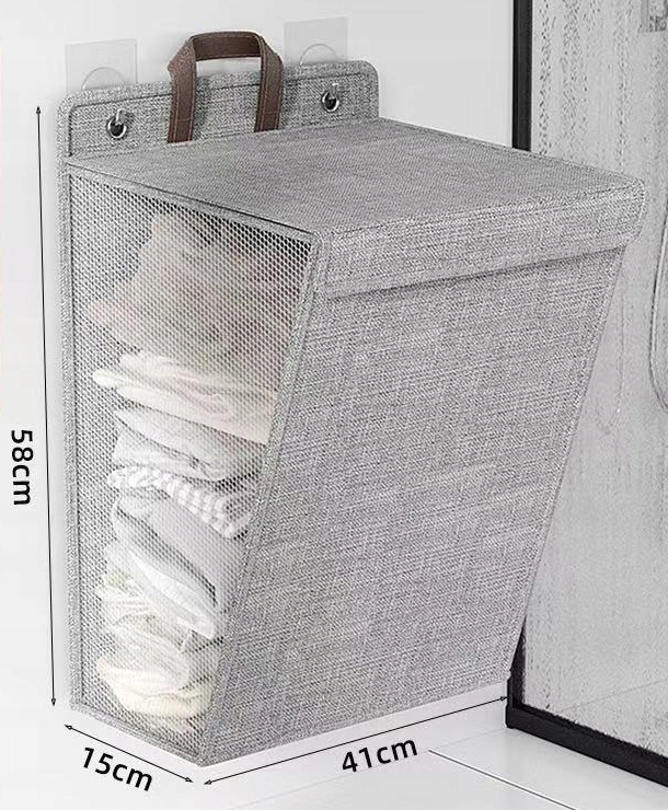 Підвісний кошик для білизни можна повісити за допомогою самоклеючих гачків, що входять у комплект, які легко встановити та не потребують свердління. Кошик виготовлений з водонепроникного, легкого та міцного матеріалу, з бічними панелями з поліпропіленової сітки, які забезпечують хорошу вентиляцію та можливість перегляду вмісту.