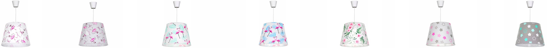 - Візерунки абажурів: блакитні фламінго, зелені фламінго, балерина на білому фоні, балерина на сірому фоні, рожеві квіти, рожеві зірки на білий фон, зелені зірочки на сірому фоні