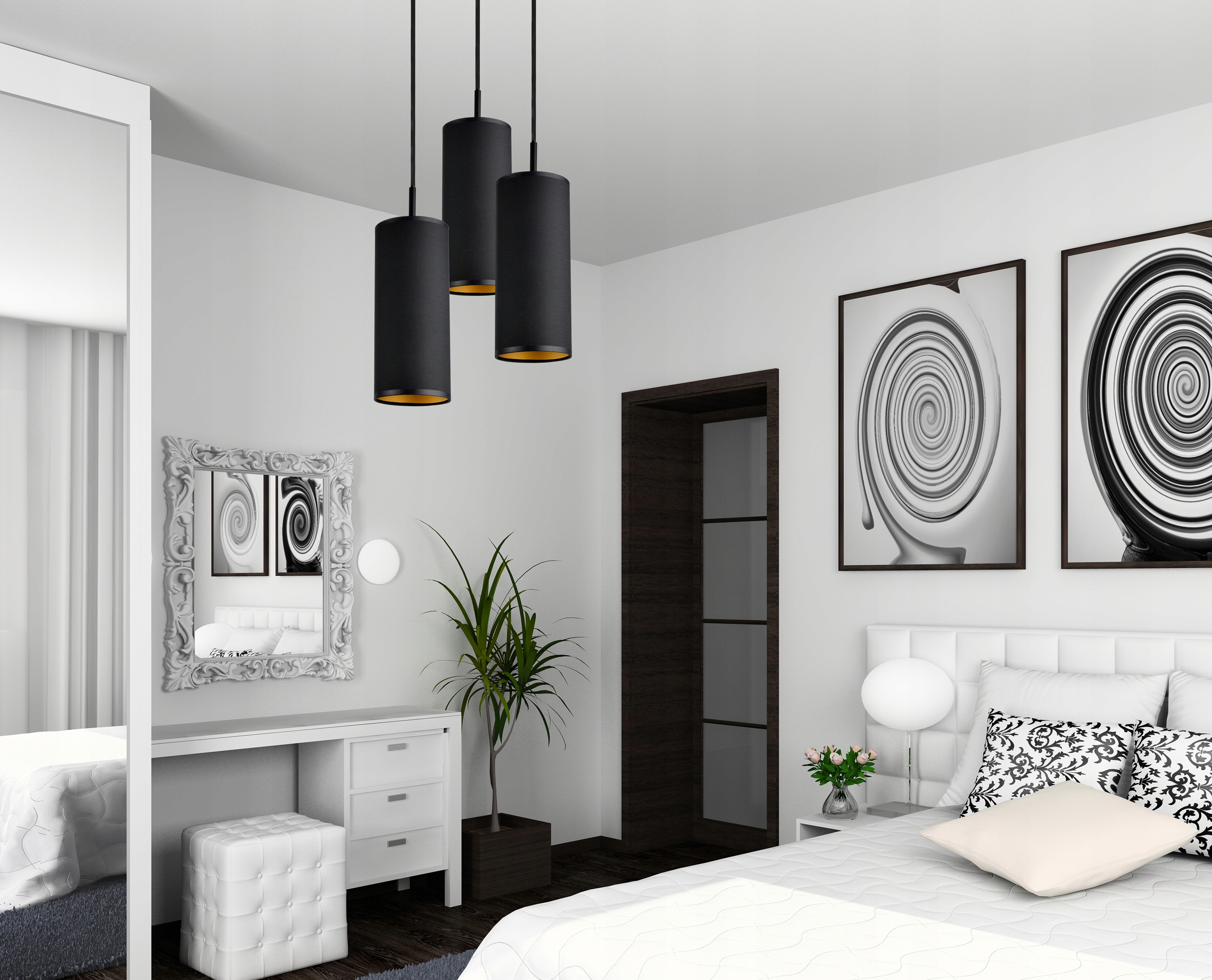 Сучасний підвісний світильник, оснащений трьома абажурами у формі циліндра та труби.