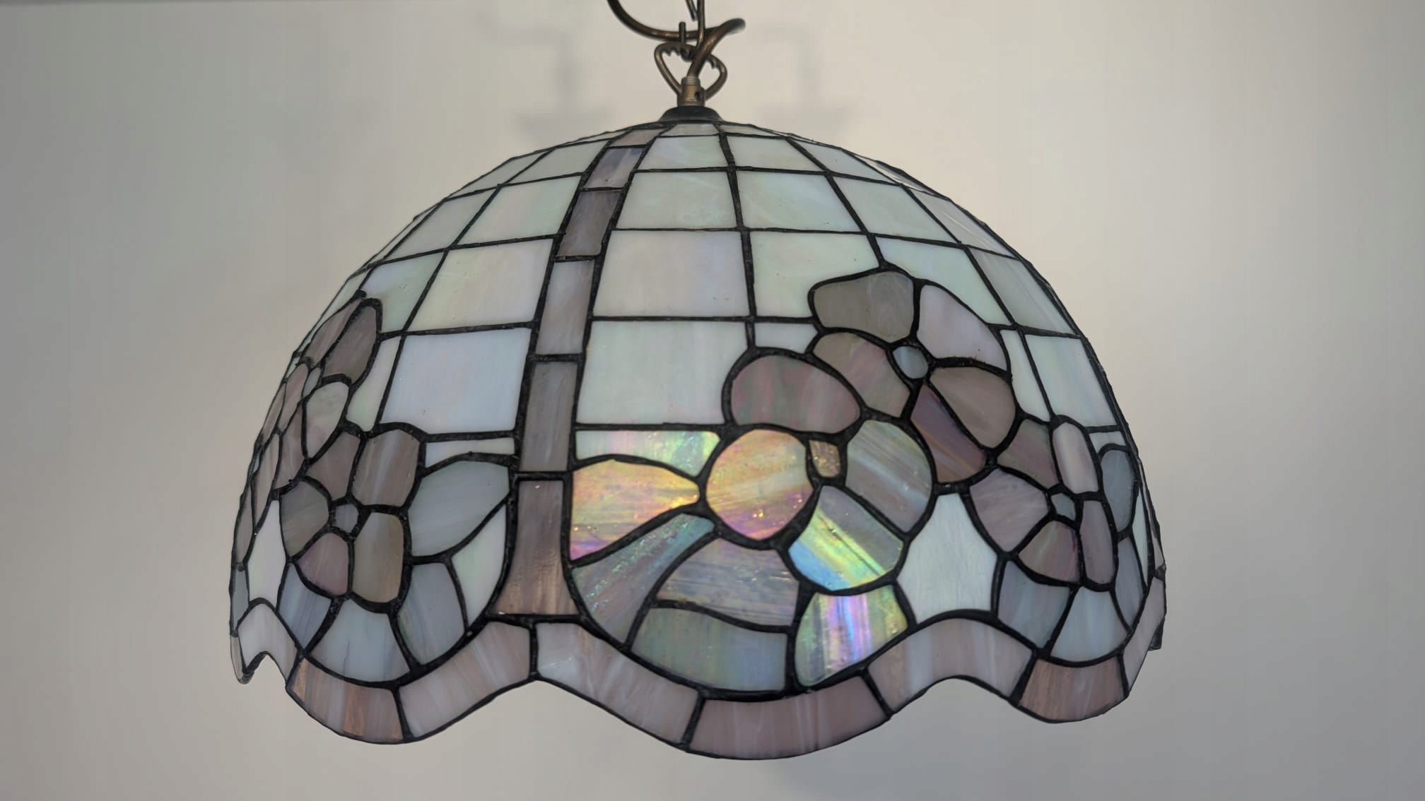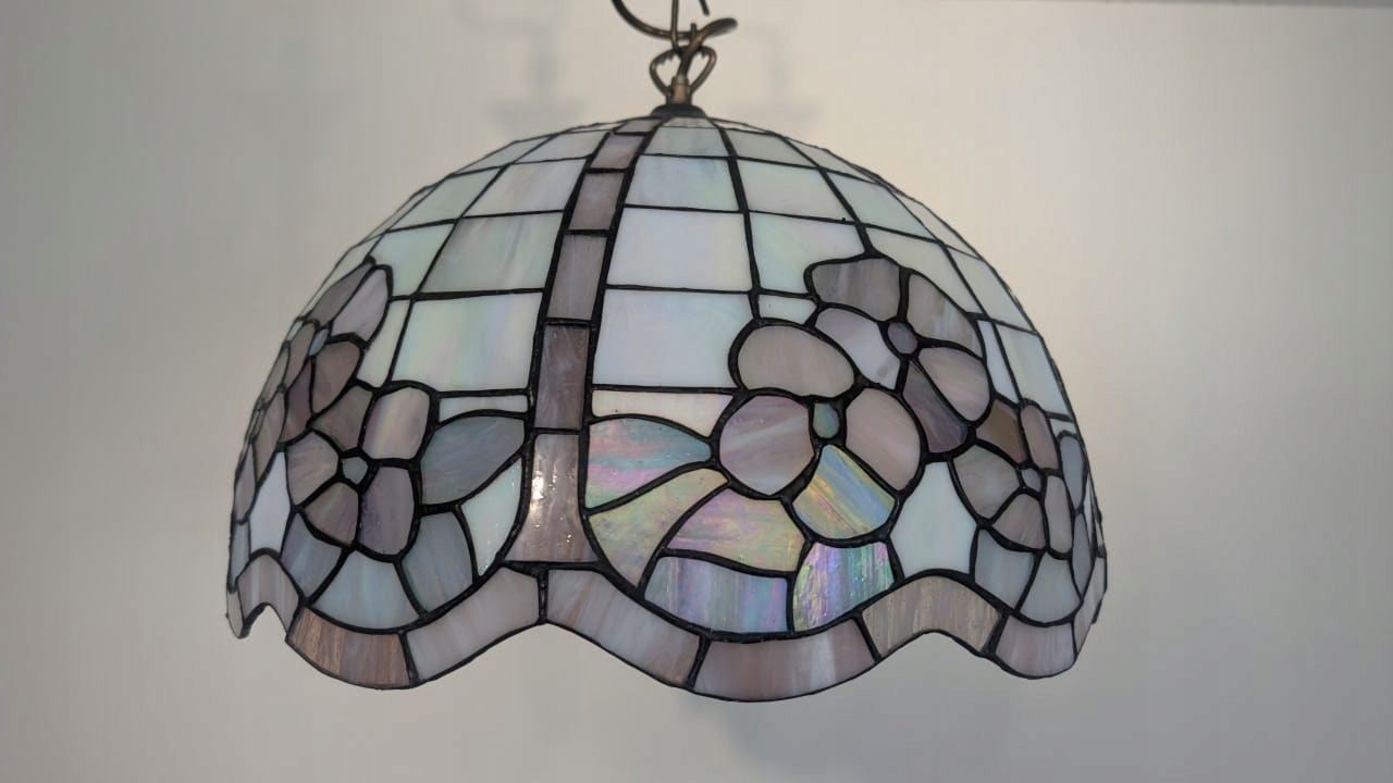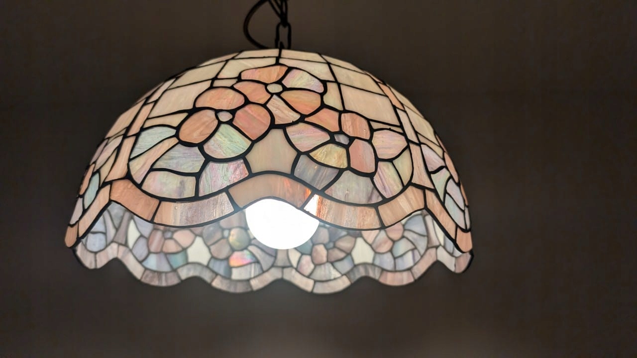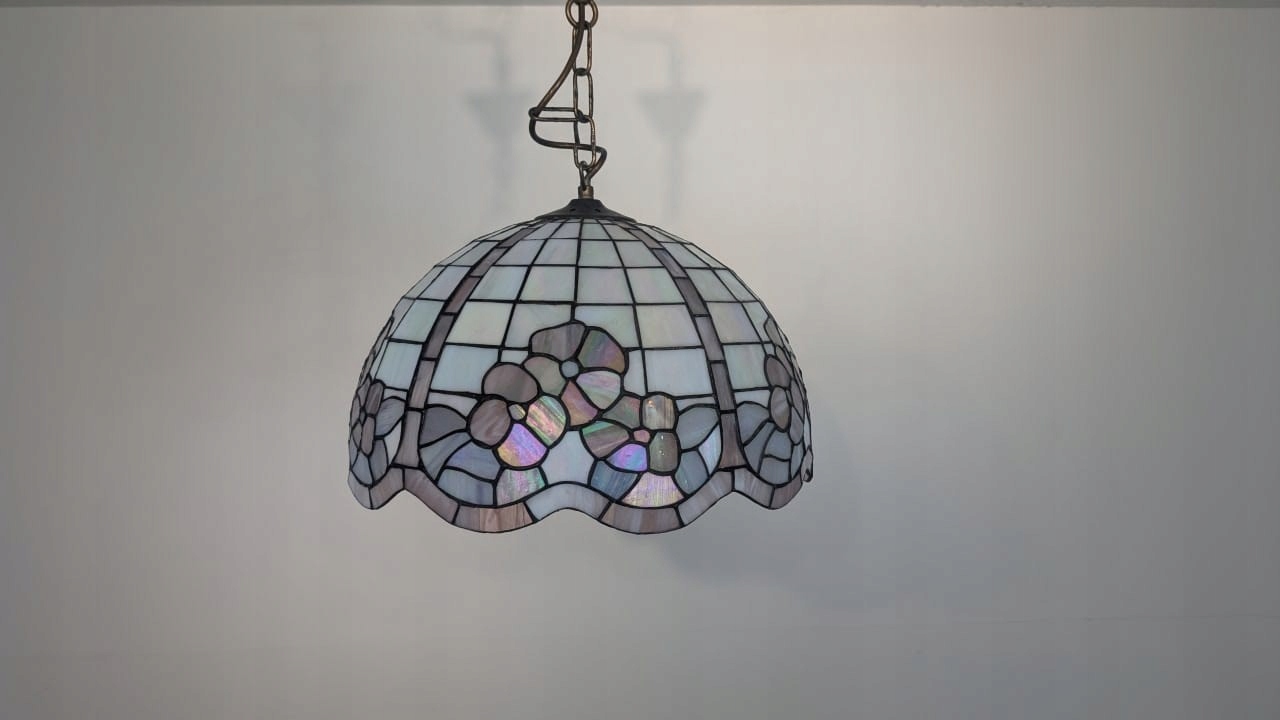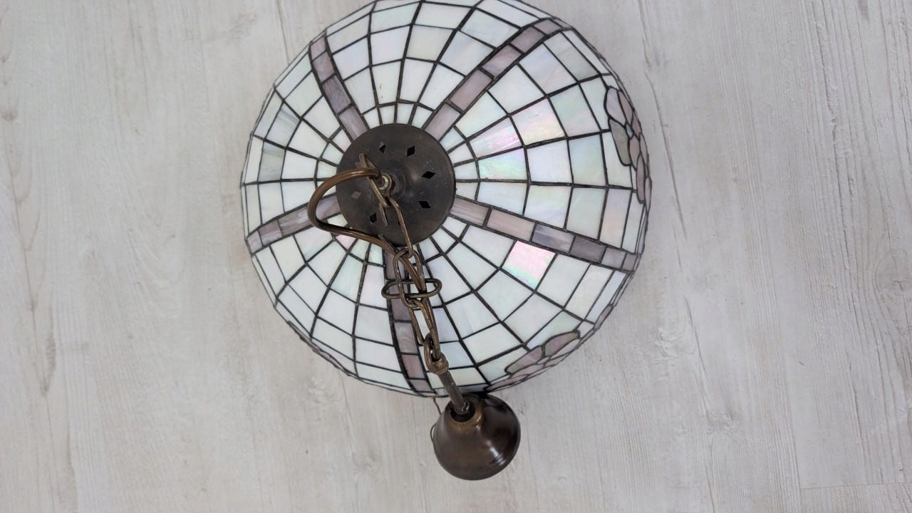 Стильний підвісний світильник у стилі Тіффані з перламутровим куполом та квітковими мотивами. Елегантний і декоративний освітлювальний елемент, який додасть шарму будь-якому інтер’єру.