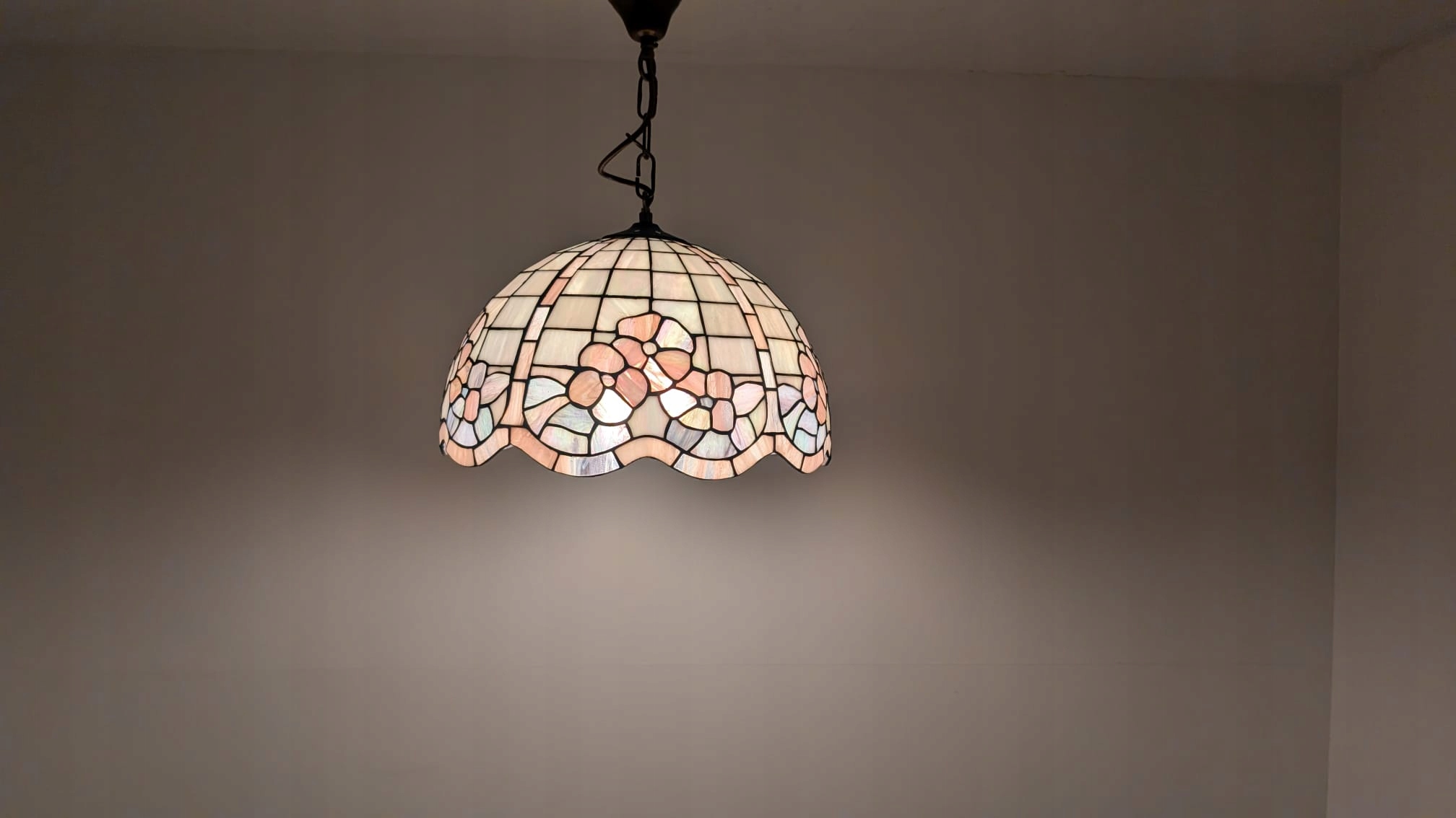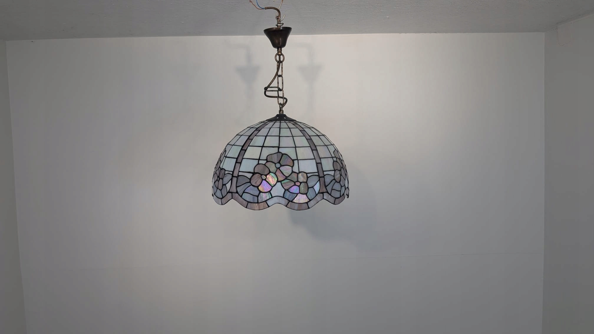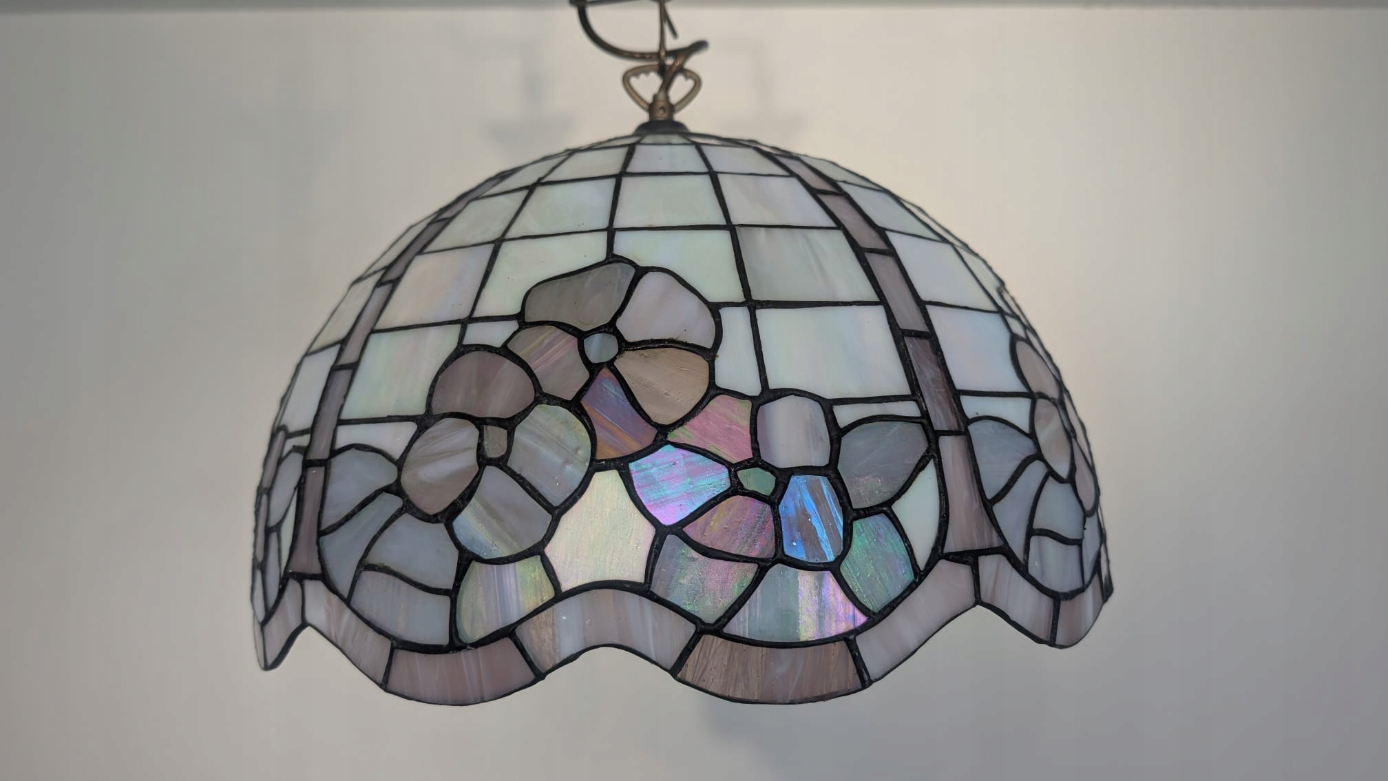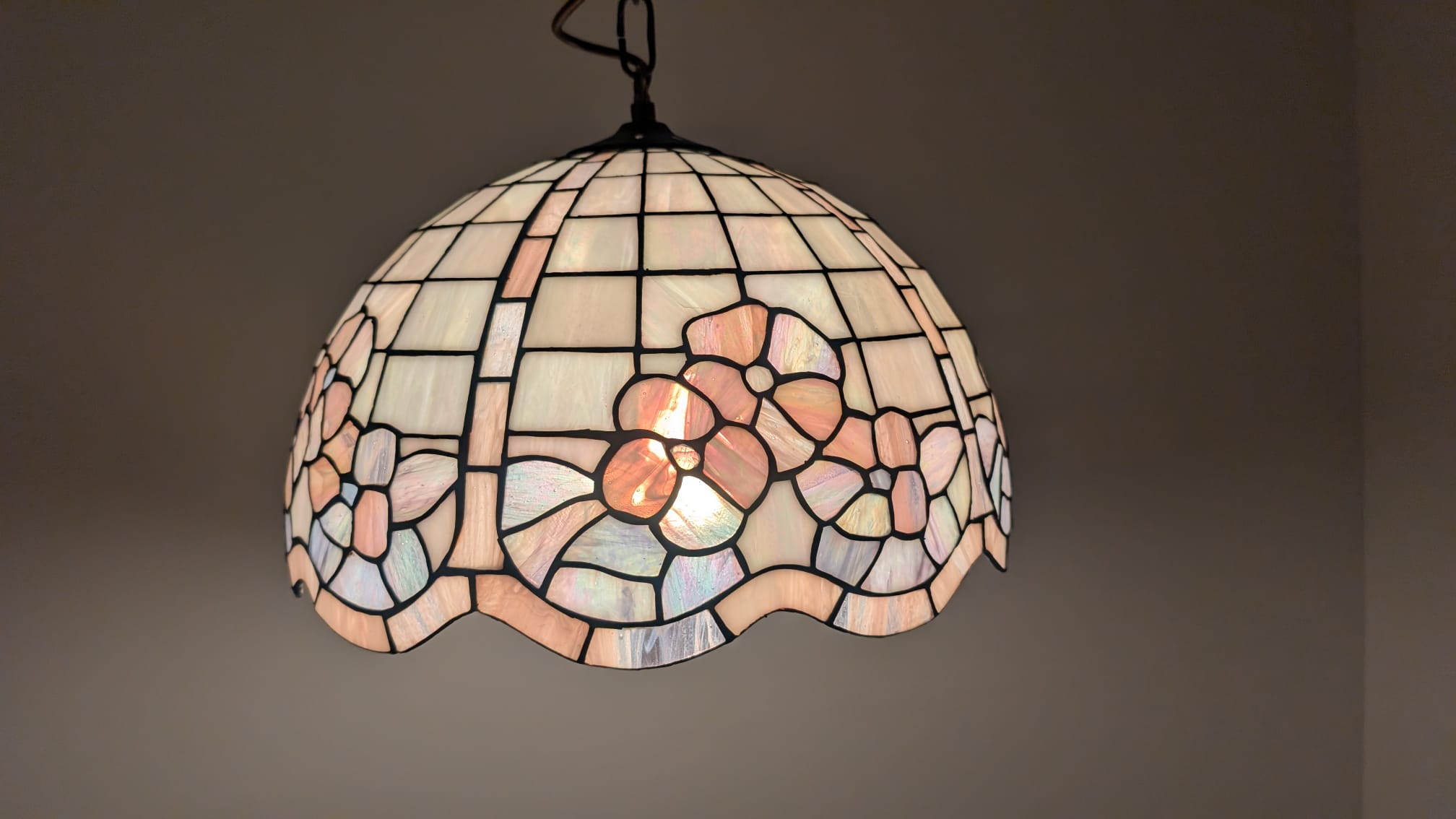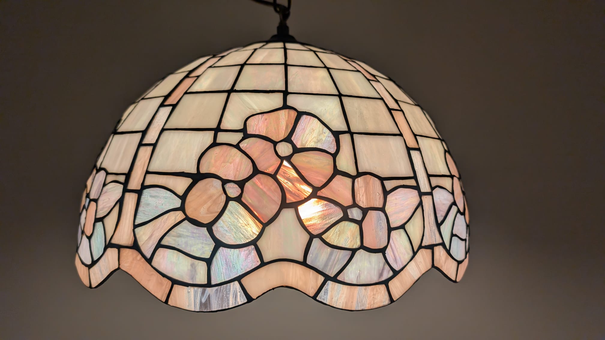 Стильний підвісний світильник у стилі Тіффані з перламутровим куполом та квітковими мотивами. Елегантний і декоративний освітлювальний елемент, який додасть шарму будь-якому інтер’єру.