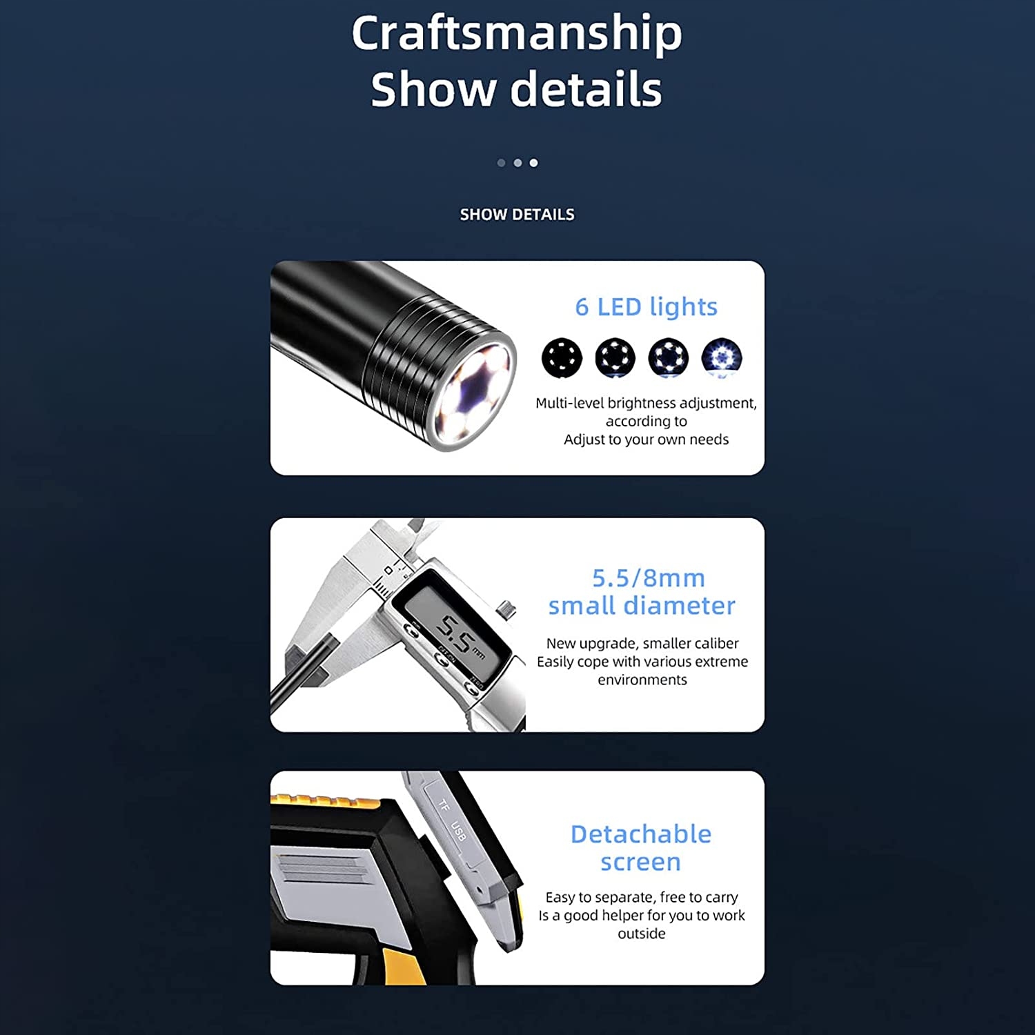 Сценарії застосування широко використовуються в ремонті автомобілів, механічному огляді, ремонті трубопроводів, перевірці побутової техніки, обслуговуванні будинків, перевірці конструкції стін, інспекції каналізації та дренажу. Зображення HD 1080P 43-дюймовий РК-екран є знімним Справжнє зображення HD 1080p Водонепроникна ендоскопічна камера I67 Немає необхідності підключати мобільний телефон і переглядати фотографії та відео високої чіткості в реальному часі швидко вирішити проблему. Регулювання яскравості світлодіодного освітлення Слідкуйте за навколишньою ситуацією, щоб відрегулювати яскравість світлодіода та отримати найкращий ефект перегляду. 8-міліметрова камера дозволяє проводити комплексний візуальний огляд у важкодоступних місцях, навіть під темною водою в трубопроводі. Поверніть зображення на 360 градусів, якщо під час ремонту трубопроводу ви виявите, що кут зображення неправильний, ви можете використовувати екранні кнопки, щоб відрегулювати кут зображення. Ендоскоп selook має вбудовану батарею великої ємності 1800 мАг, здатну безперервно працювати протягом 35 годин. ручна ендоскопічна камера. Задоволеність клієнтів Ми обіцяємо завжди надавати найкращі продукти та послуги, щоб задовольнити наших цінних клієнтів. Якщо у вас є запитання. Ми полегшуємо покупки.