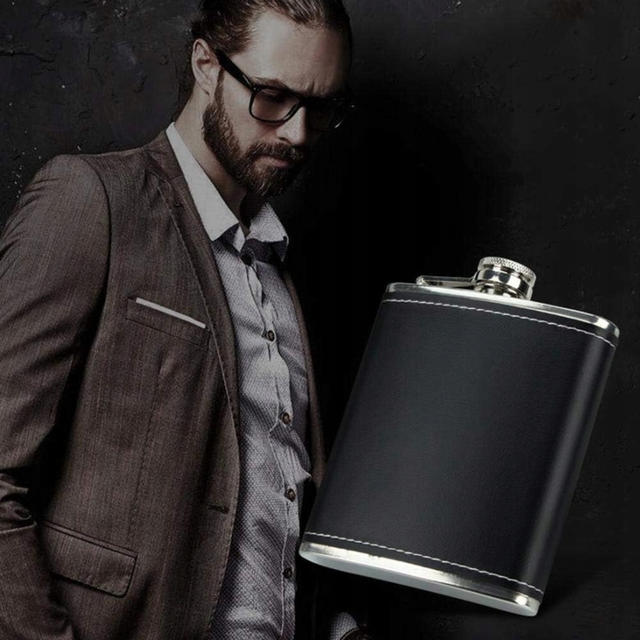 Piersiówka stalowa nierdzewna czarna metalowa na prezent skóra duża 240ml