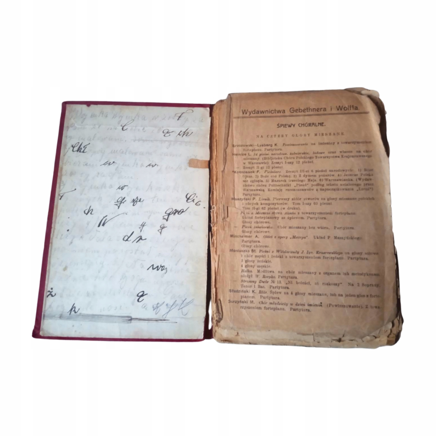 Пропоную до продажу: Колективний пісенник - мішаний хор, сопрано. Пісенник для польських шкіл. Автор: Пьотр Машинський. Видавець: Gebethner and Wolff. Рік випуску: невідомий. Обкладинка тверда, написи тиснені та позолочені. 144 стор.. Додається дитяча картина на релігійну тематику того ж періоду, що й книга, та два аркуші паперу з нотами та текстом народної пісні «Калина», автор: О.М. Жуковський. Поганий стан. Обкладинка брудна, в плямах, книжковий блок розірваний, багато сторінок розшаровуються. Краї та кути приблизно половини сторінок пом’яті, потерті, деякі злегка порвані.