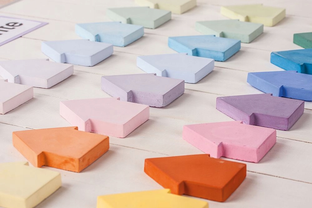 Якщо ви хочете, щоб гіпсові зліпки були не просто білими, ви можете пофарбувати їх зовні після висихання, наприклад, акриловими фарбами. Щоб вони відразу були в певний колір, гіпс необхідно підфарбувати в масі, перед тим, як залити її в форму для лиття. Як просто пофарбувати гіпс? Відмірявши кількість гіпсу, необхідного для заповнення форми, додайте відповідну кількість пігменту фарби. Його кількість буде залежати від наших уподобань насиченості кольору. Це потрібно визначити експериментально, але ми скажемо вам, що чайна ложка порошку пігменту ефективно забарвить 250 г паризького гіпсу. Обидва інгредієнта необхідно добре перемішати, потім залити водою, перемішати і заповнити форму. Окрім штукатурки та фарб, ми можемо використовувати порошковий пігмент для зміни кольору мозаїчної затирки, структурні пасти та затверджувач тканини, шкіру та папір, які є на інших аукціонах. Штукатурні пігменти можна змішувати, щоб отримати нескінченну кількість кольорів. Напис «Вітаю весну» виконано за допомогою мильного штампа.