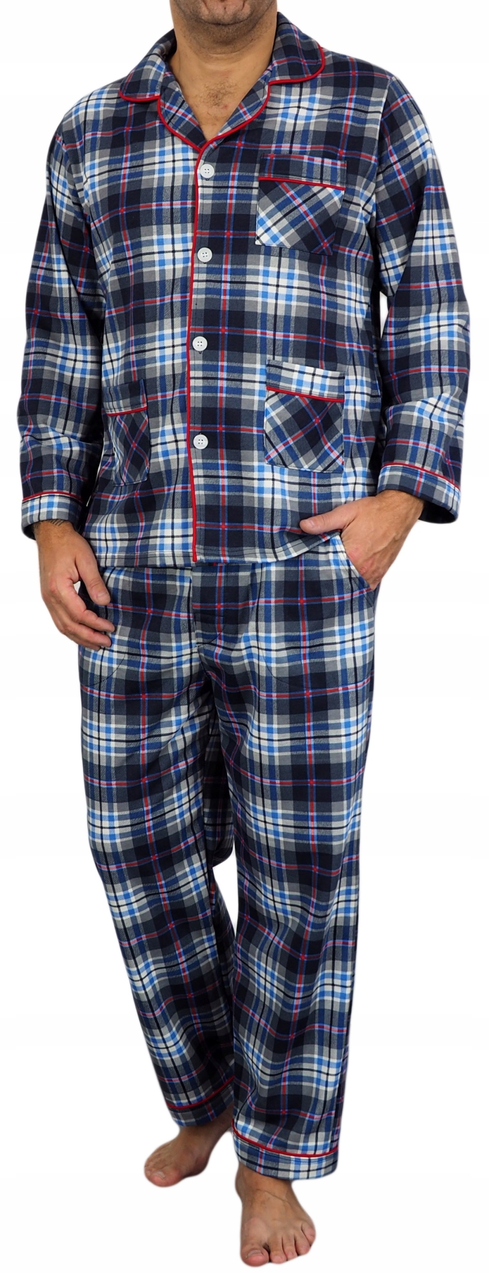 Зручна та стильна чоловіча піжама з м'якої, приємної на дотик бавовняної фланелі. Комплект складається з сорочки на гудзиках і довгих штанів. Штани на зручній шліфовці, що застібається на гудзики. Темно-синій, синьо-білий картатий візерунок із червоним акцентом надає йому класичний характер. Сорочка має комір, нагрудну кишеню та дві бічні кишені, прикрашені тонкою червоною окантовкою. Штани з прямими штанинами забезпечують свободу рухів і комфорт під час сну.