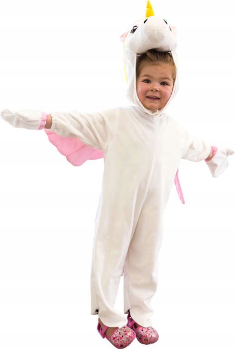 Костюм надзвичайно милий і схожий на єдинорога. Виготовлена з білого, приємного на дотик матеріалу. На спинці костюма є крила і пухнастий хвостик.