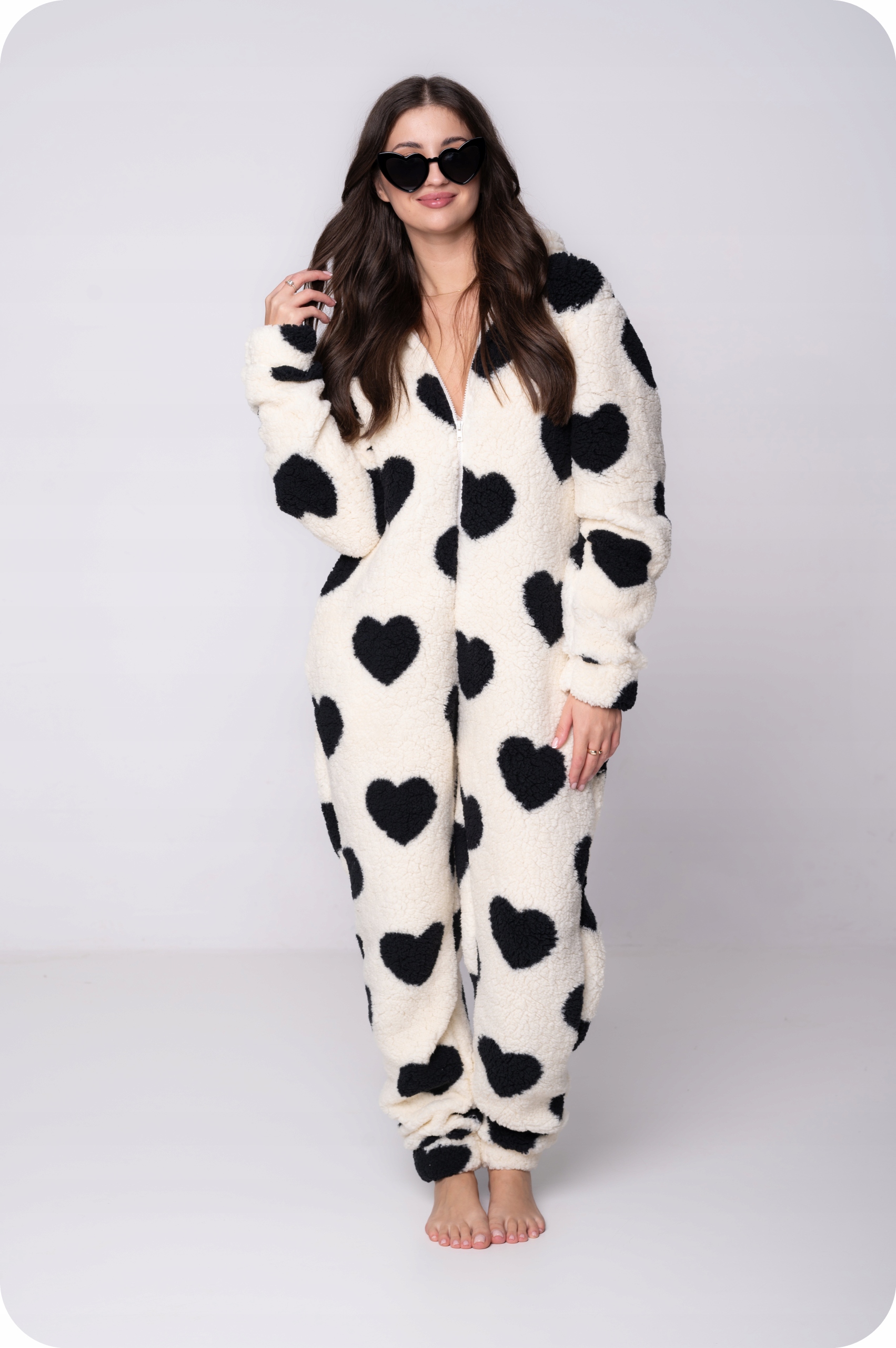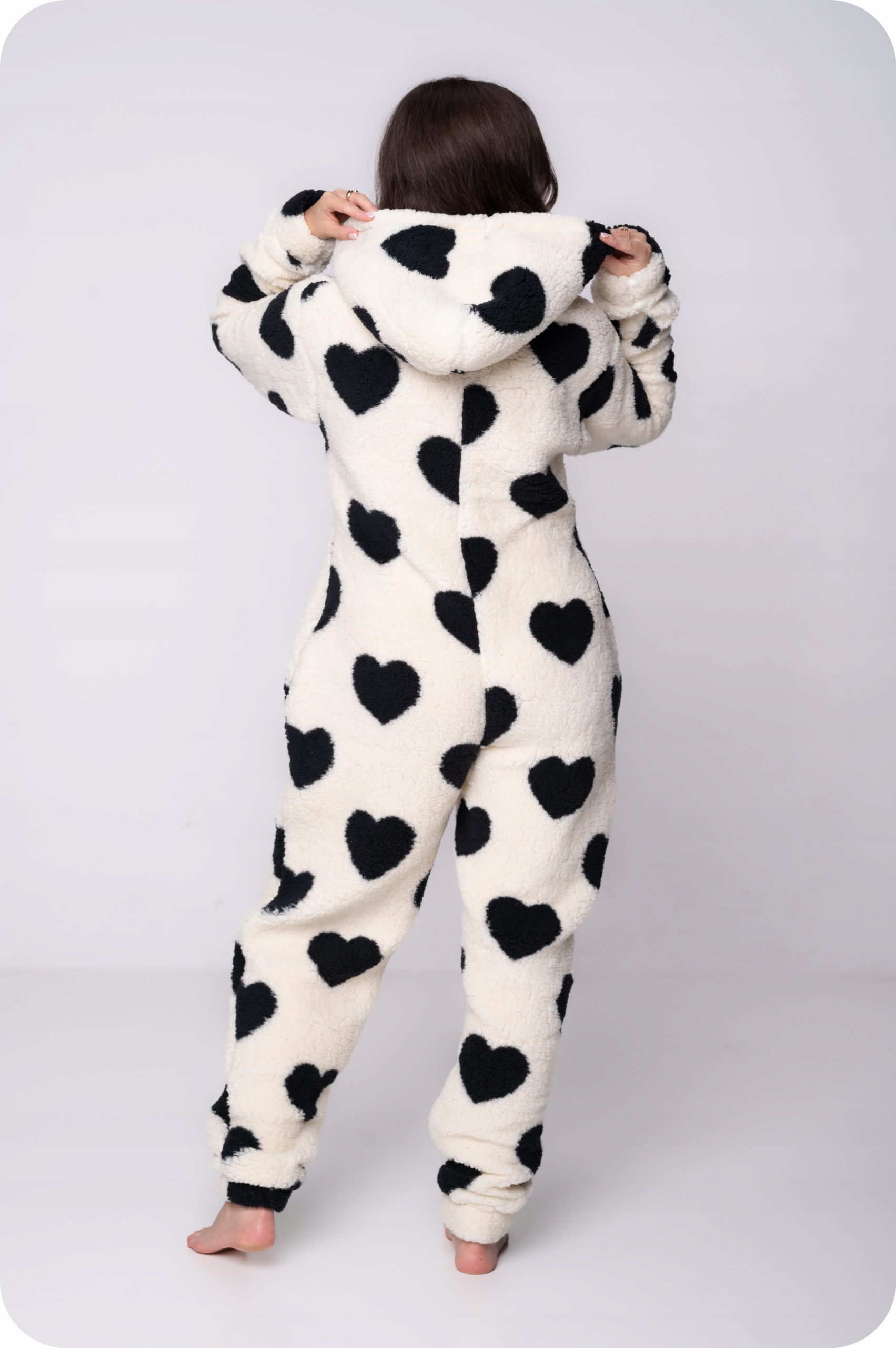 Піжамний комбінезон ONESIE Kigurumi для дорослих - білий з чорними сердечками ⭐⭐⭐⭐⭐