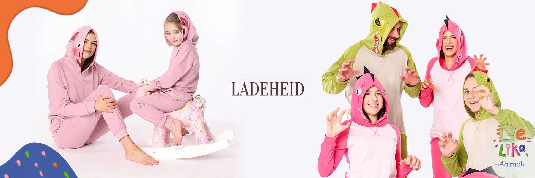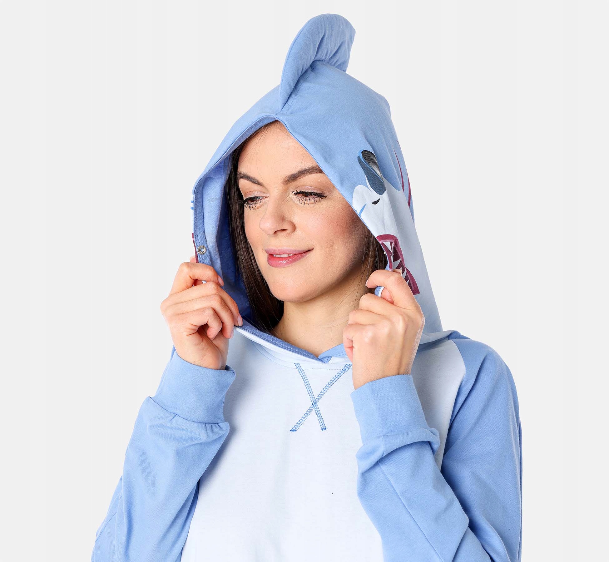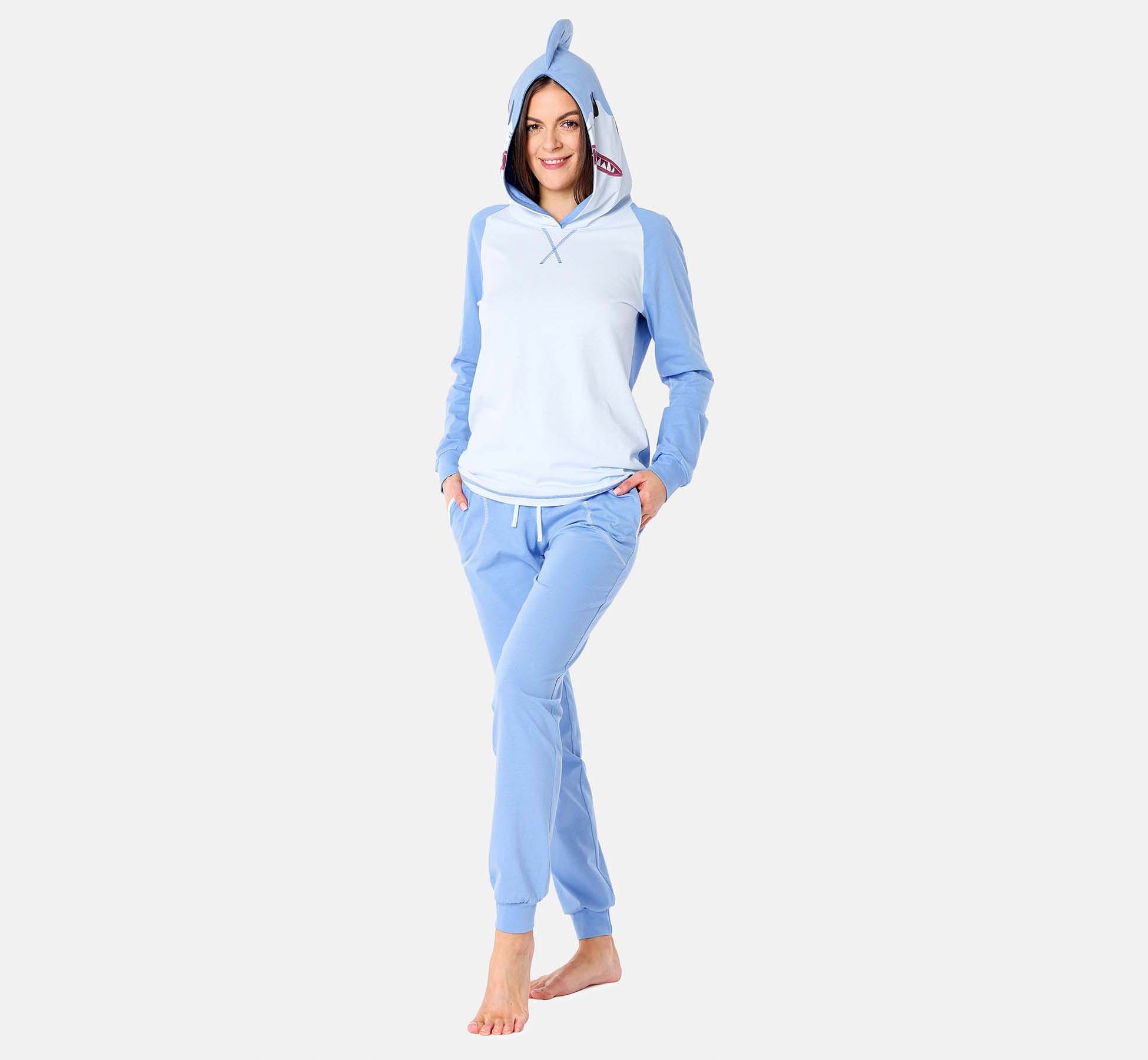 Жіночі бавовняні піжами; Костюм вихованця; Сертифікати: Oeko-Tex Standard 100, а для друку також GOTS; Довгі рукави і штани; Капюшон із тваринним принтом і застібкою; Дві кишені в штанах; Гумка, вшита в пояс; унісекс; Зроблено в ЄС