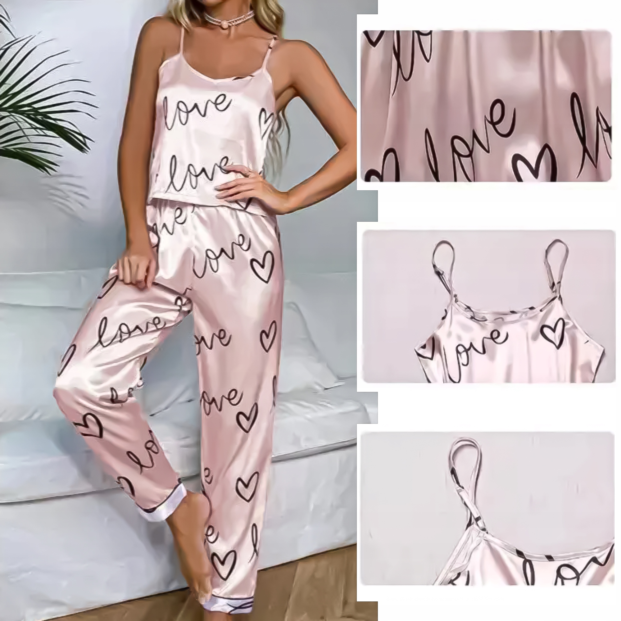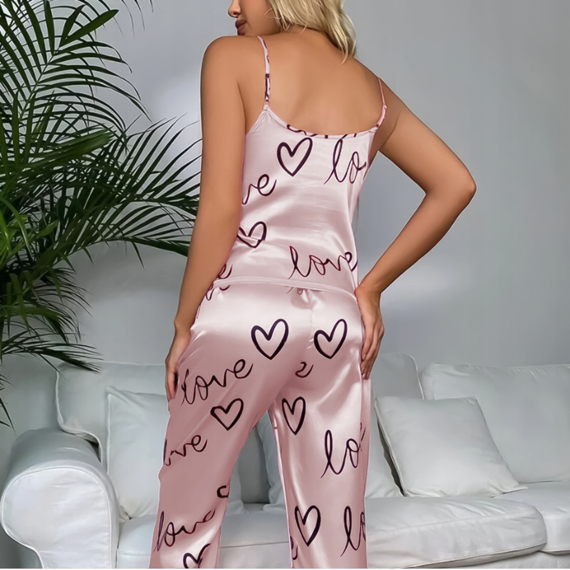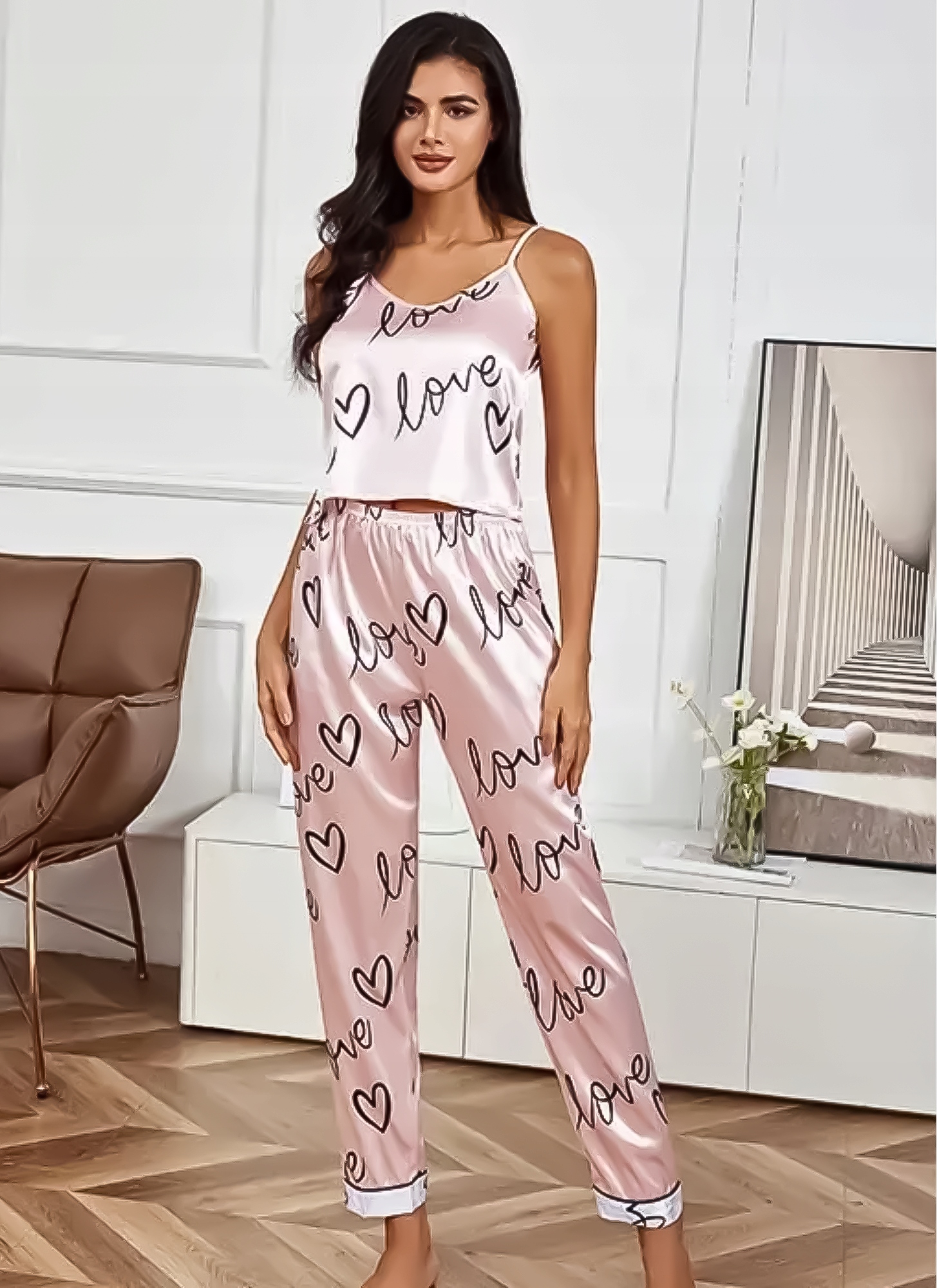 Пудрово-рожевий колір у поєднанні з чарівними написами «LOVE» і сердечками надає піжамам надзвичайний шарм і романтичний вигляд, який підкреслює природну жіночність жінки, яка їх одягає.