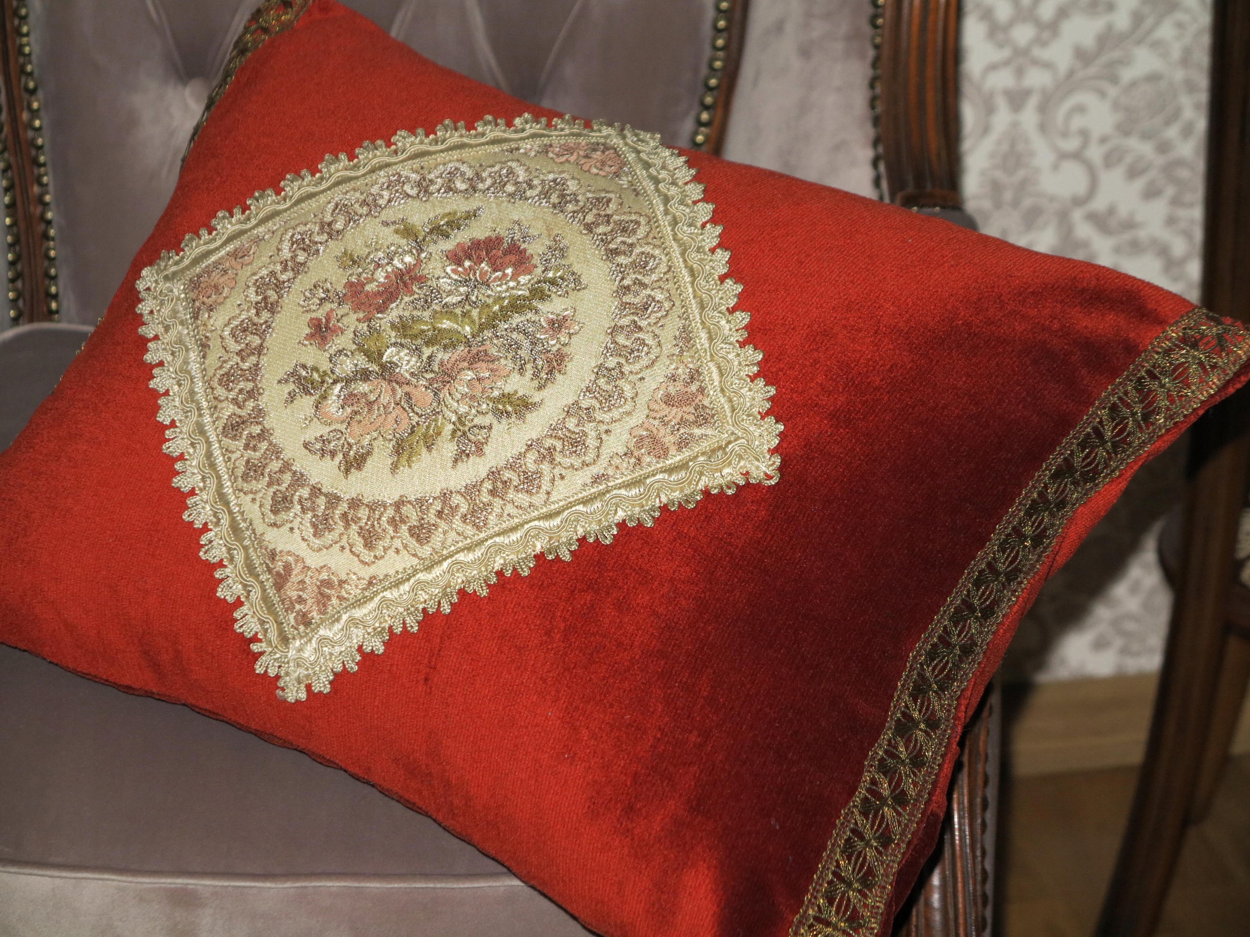 Предмет аукціону дуже декоративний, стильна, велика, старовинна подушка, декорована гобеленом та металізованою галантереєю. Б/у, в дуже хорошому стані та якості, готовий до використання. Рекомендую