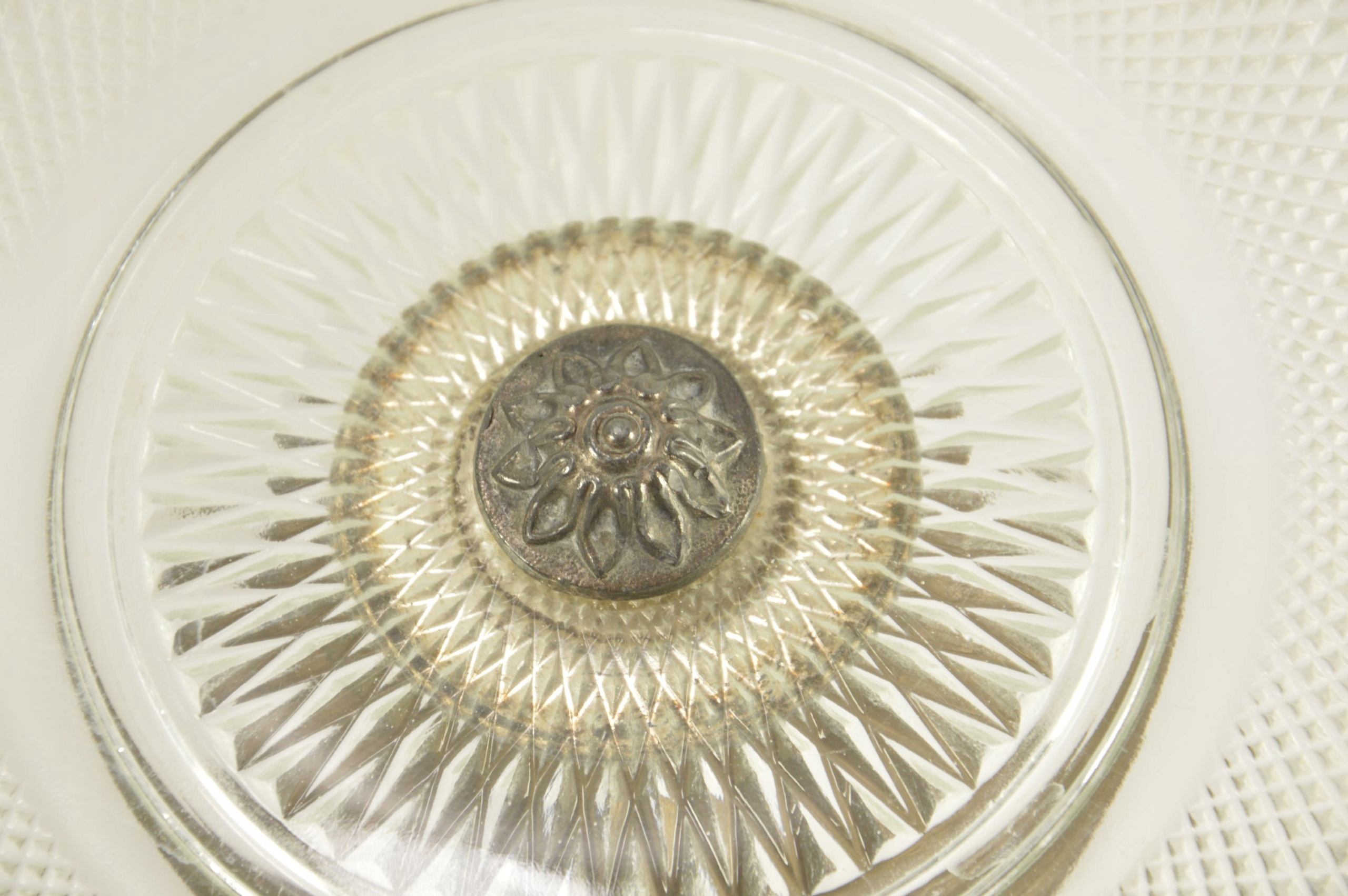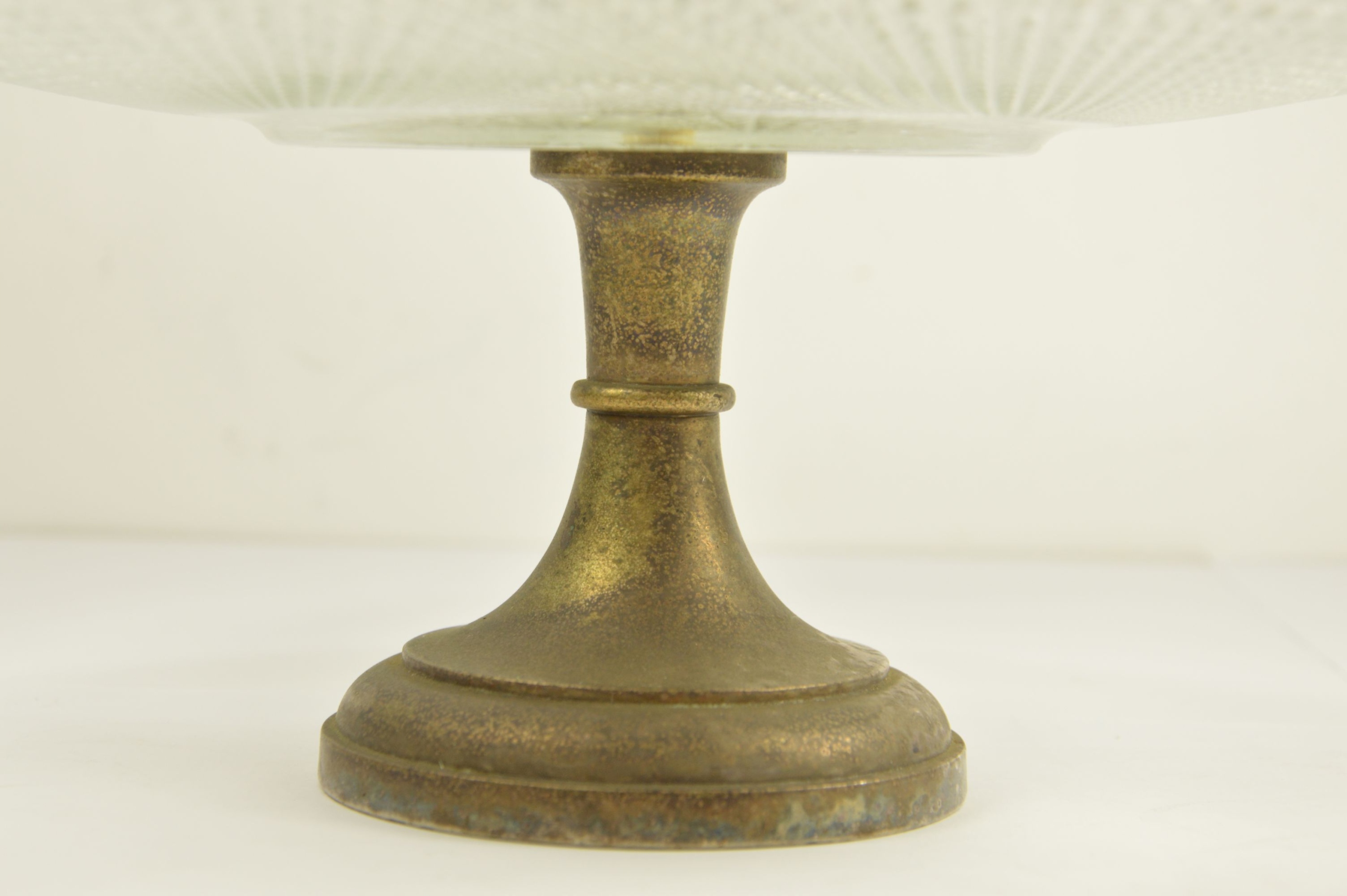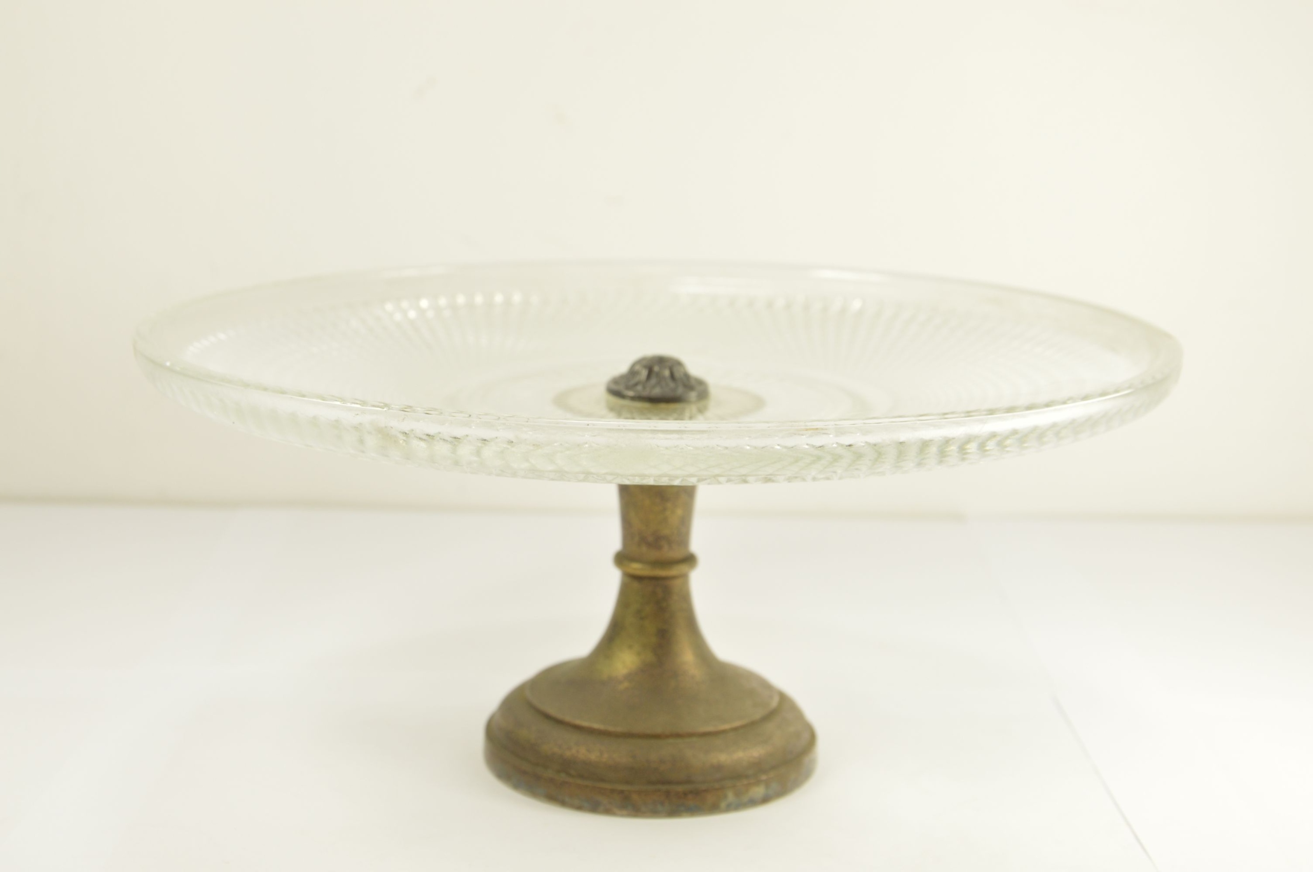 Красива стара скляна тарілка на гальованій ніжці. Гарно виглядає, має цікаву форму та рідкісне поєднання матеріалів. Ніжка покрита благородною натуральною патиною, на склі є кілька дрібних подряпин від використання.