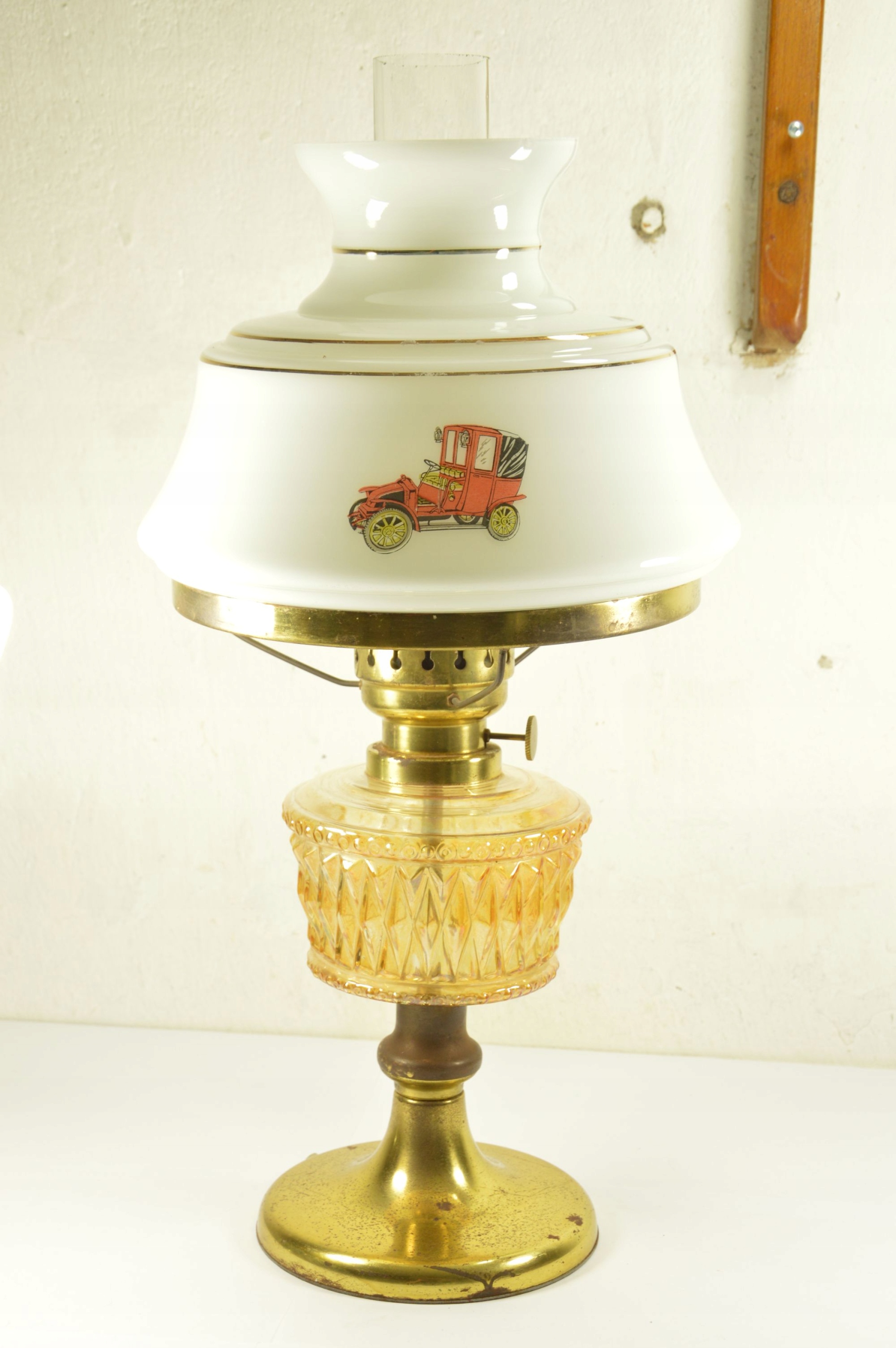 Красива, стара, велика електрична лампа, стилізована під гасову лампу. У набір входить металевий і скляний корпус, красивий абажур з машинками і камін з біркою. Відсутній шнур живлення, абажур з незначними потертостями.