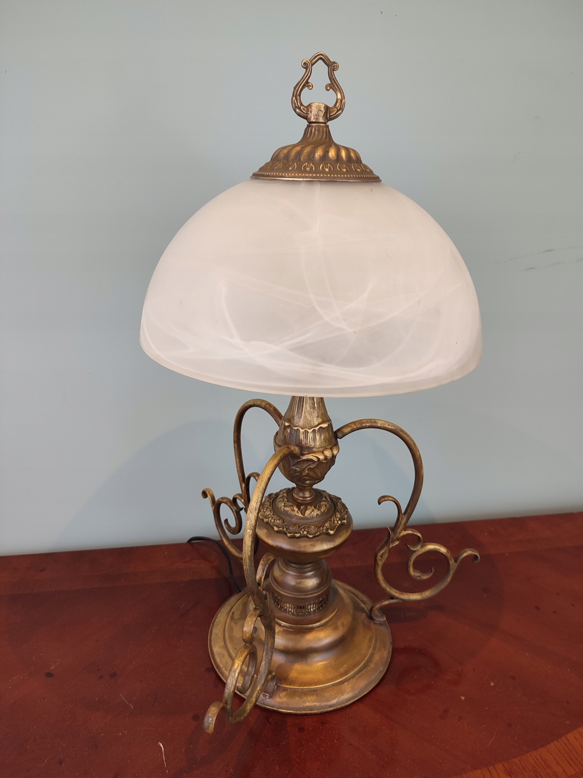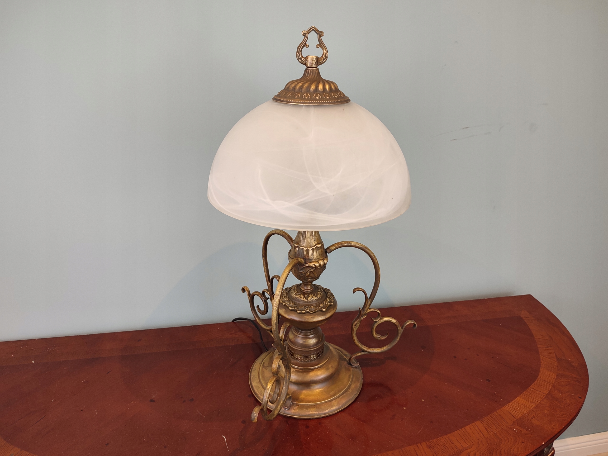 PIĘKNA UNIKATOWA MOSIĘŻNA LAMPA Z KLOSZEM MLECZNYM