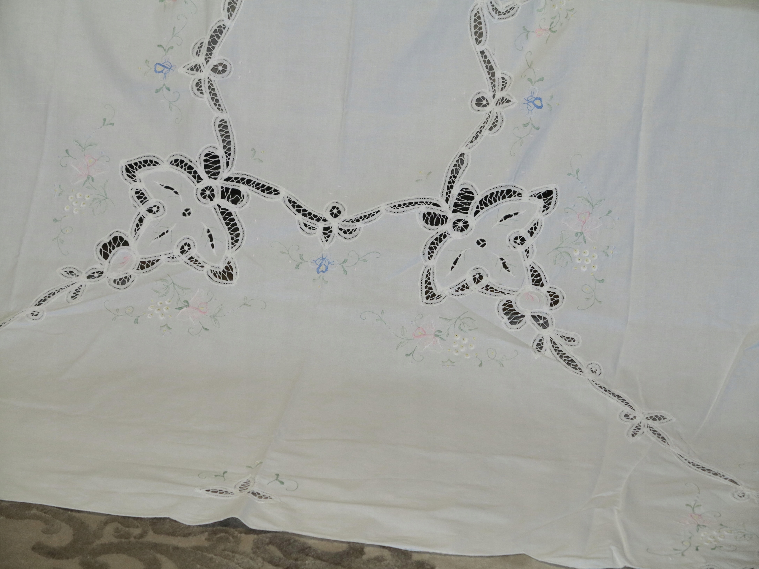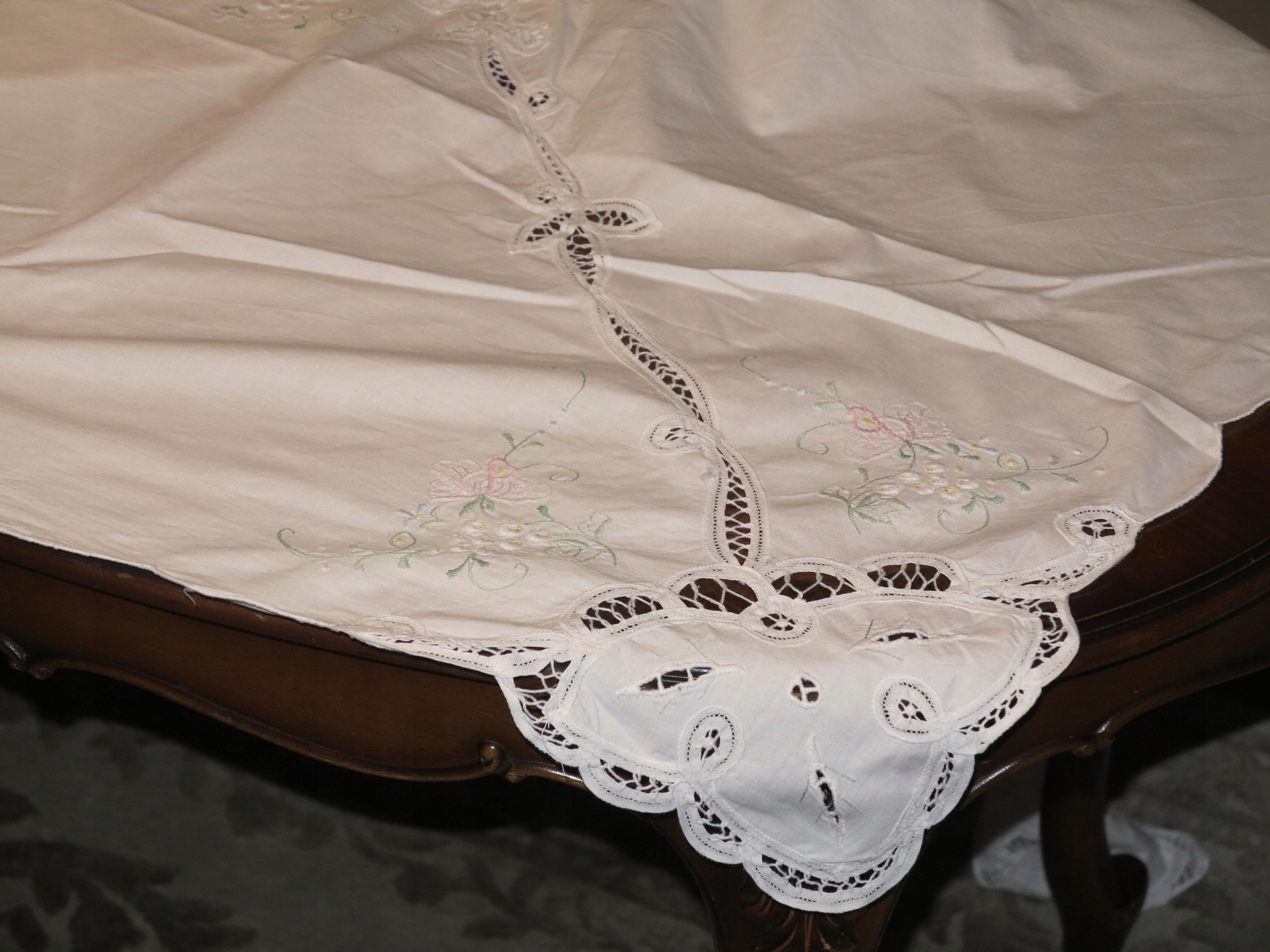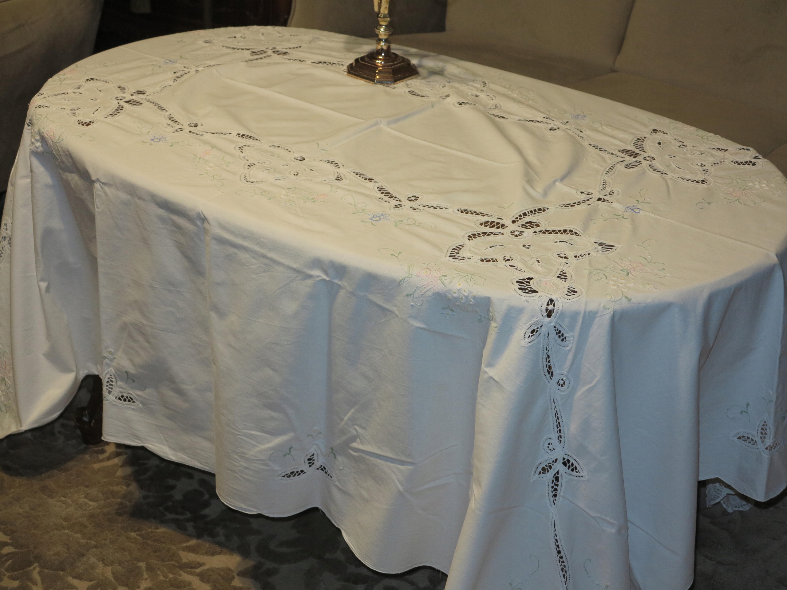 ЧУДОВУ БІЛУ ЛЬНЯНУ СКАТЕРТИНУ З БРЮССЕЛЬСЬКИМ МЕРЕЖИВОМ, ВИШИВКОЮ ТА АЖУРОМ