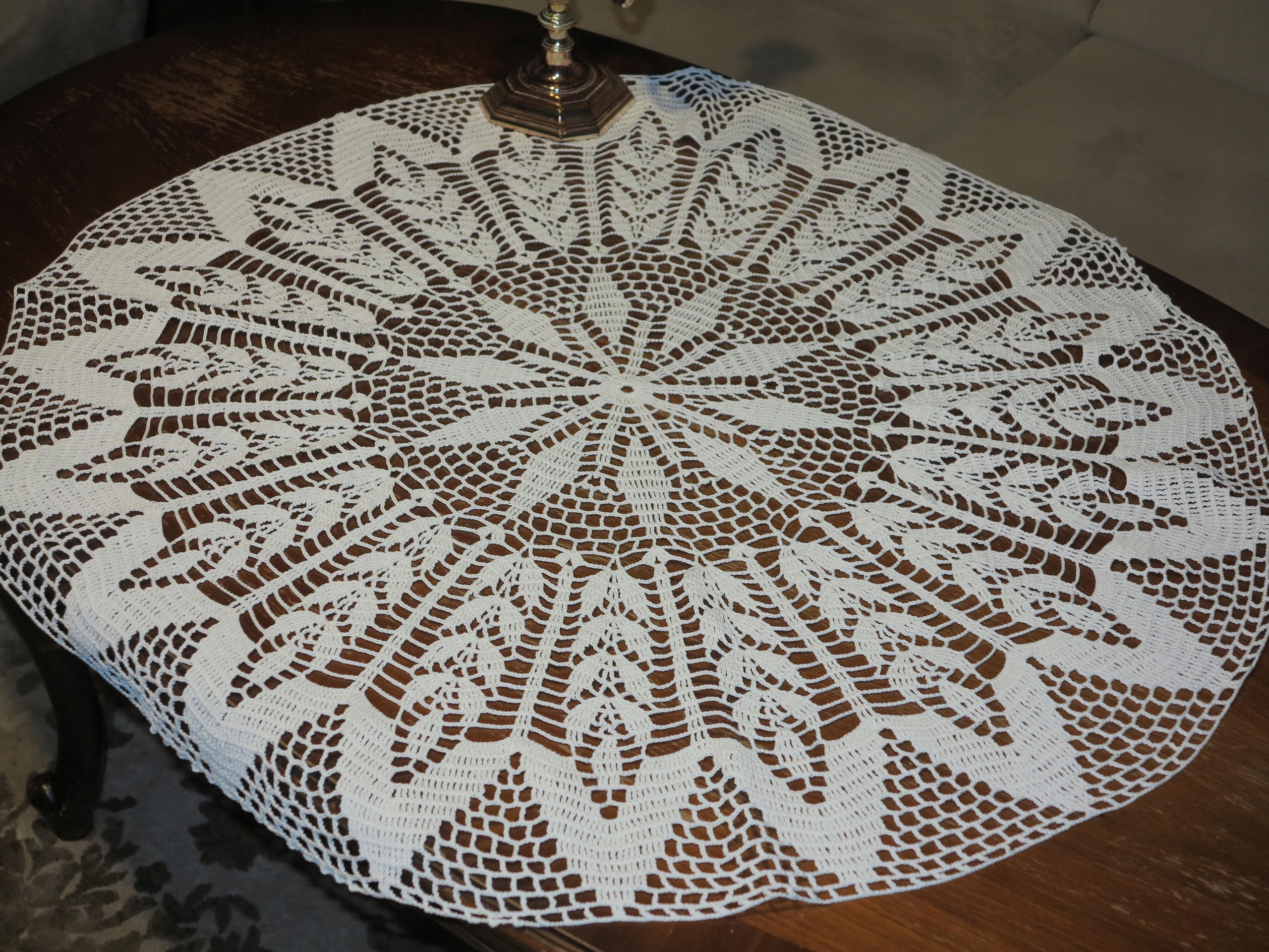 Предметом аукціону є гарна скатертина, ручного в’язання з бавовняних ниток, з складний візерунок. Красиво виглядає на столі. Його розміри: діаметр: 85 см. Б/у, в супер хорошому та якісному стані. Рекомендую.