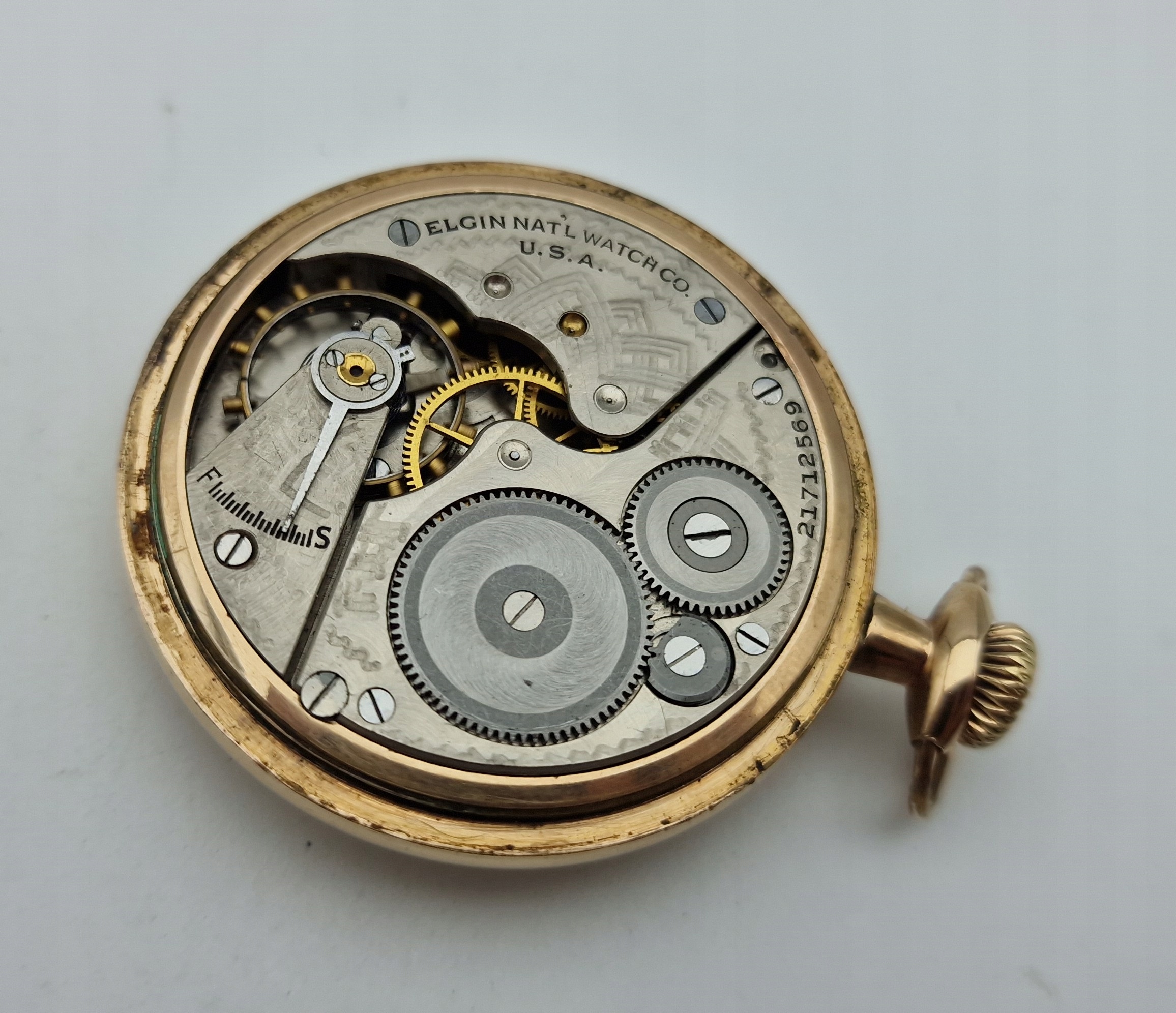 - Позолочений механізм годинника з 15 каменями, з анкерним спуском, з підписами: "ELGIN NATL WATCH CO USA". Механізм працює добре й точно, після огляду та обслуговування годинникарем, і він у відмінному стані.