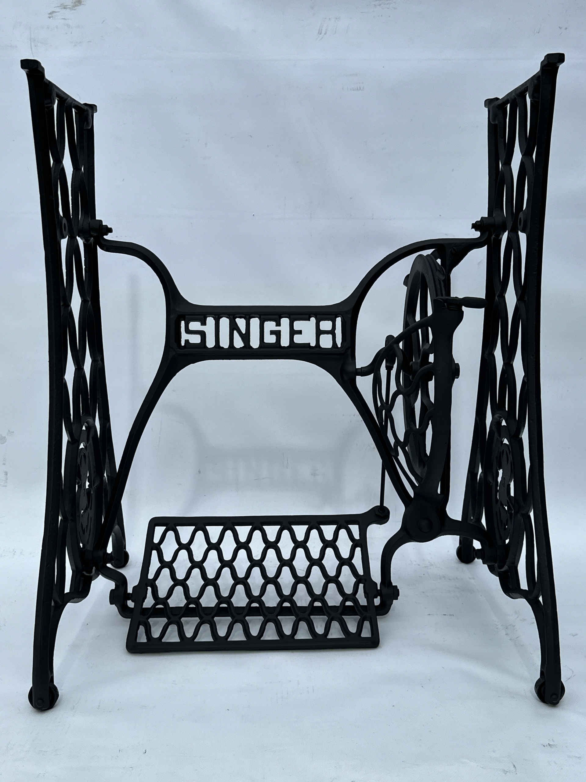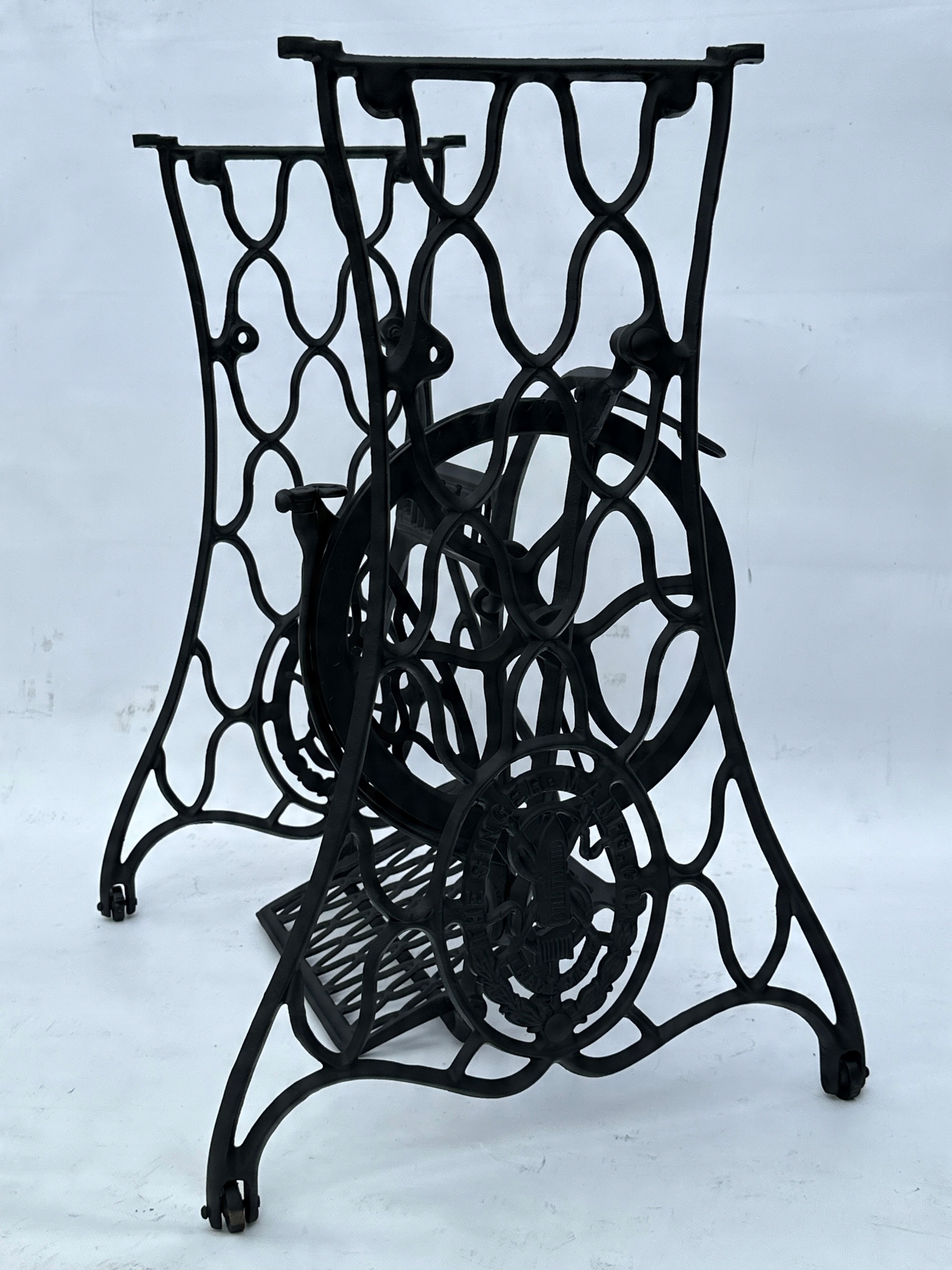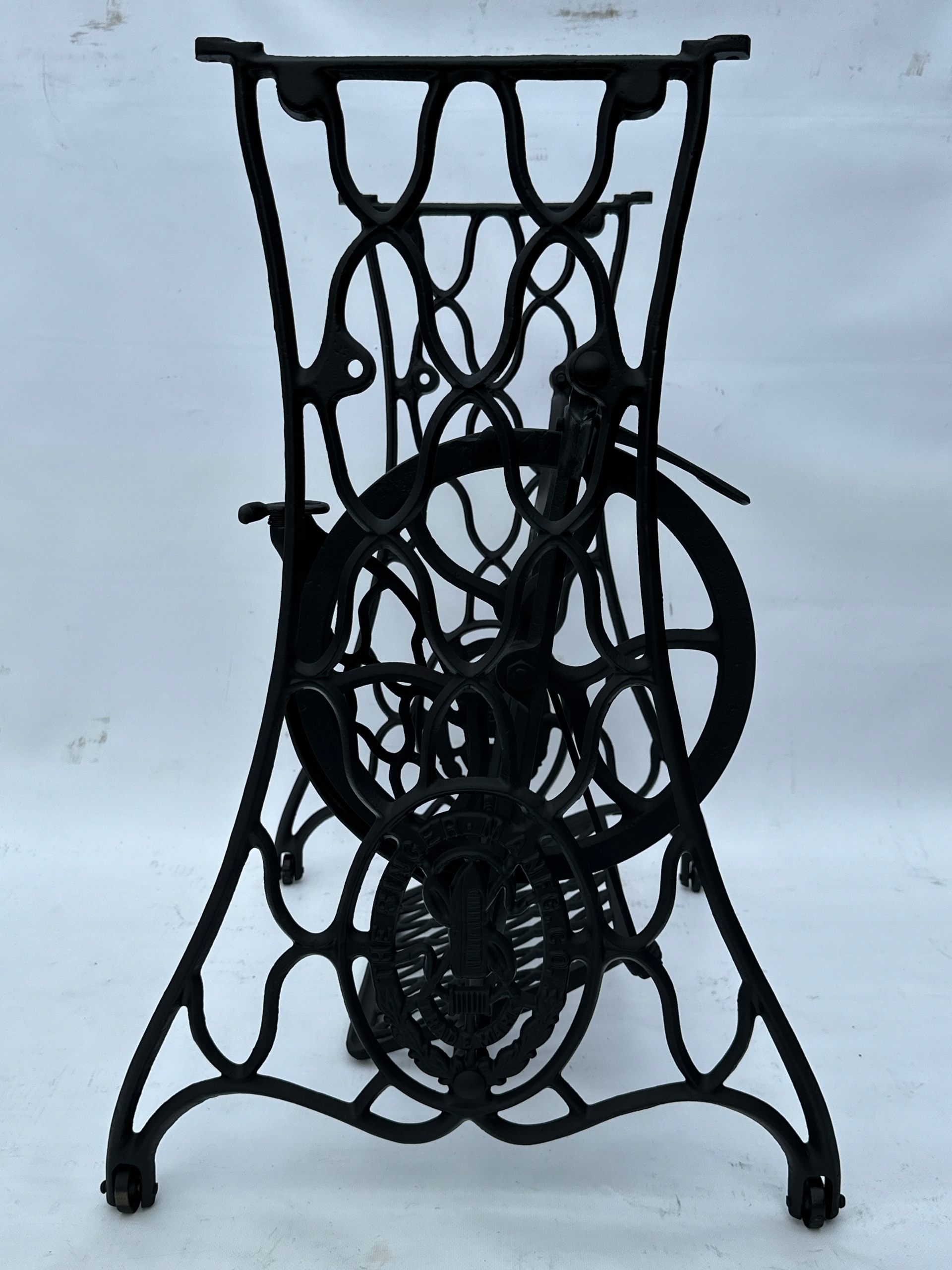 Предмет продажу стара чавунна основа від швейної машинки SINGER. Дуже гарний візерунок. З боків написи THE SINGER MANFG. ЩО. ТОРГОВА МАРКА. Має всі 4 колеса в нижній частині.Додатковою перевагою є металевий елемент, що з'єднує колесо з педаллю приводу, завдяки чому ми можемо бути впевнені, що його не з'їдять дровожери, які можливий в основах з дерев'яним елементом.