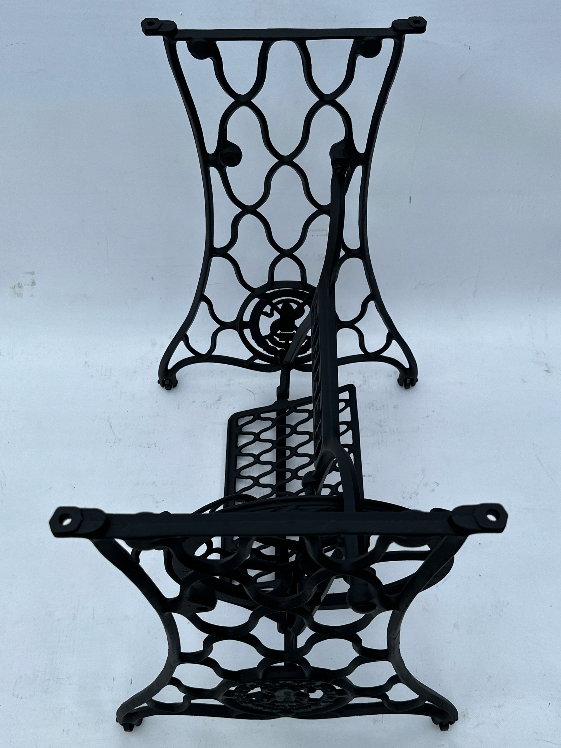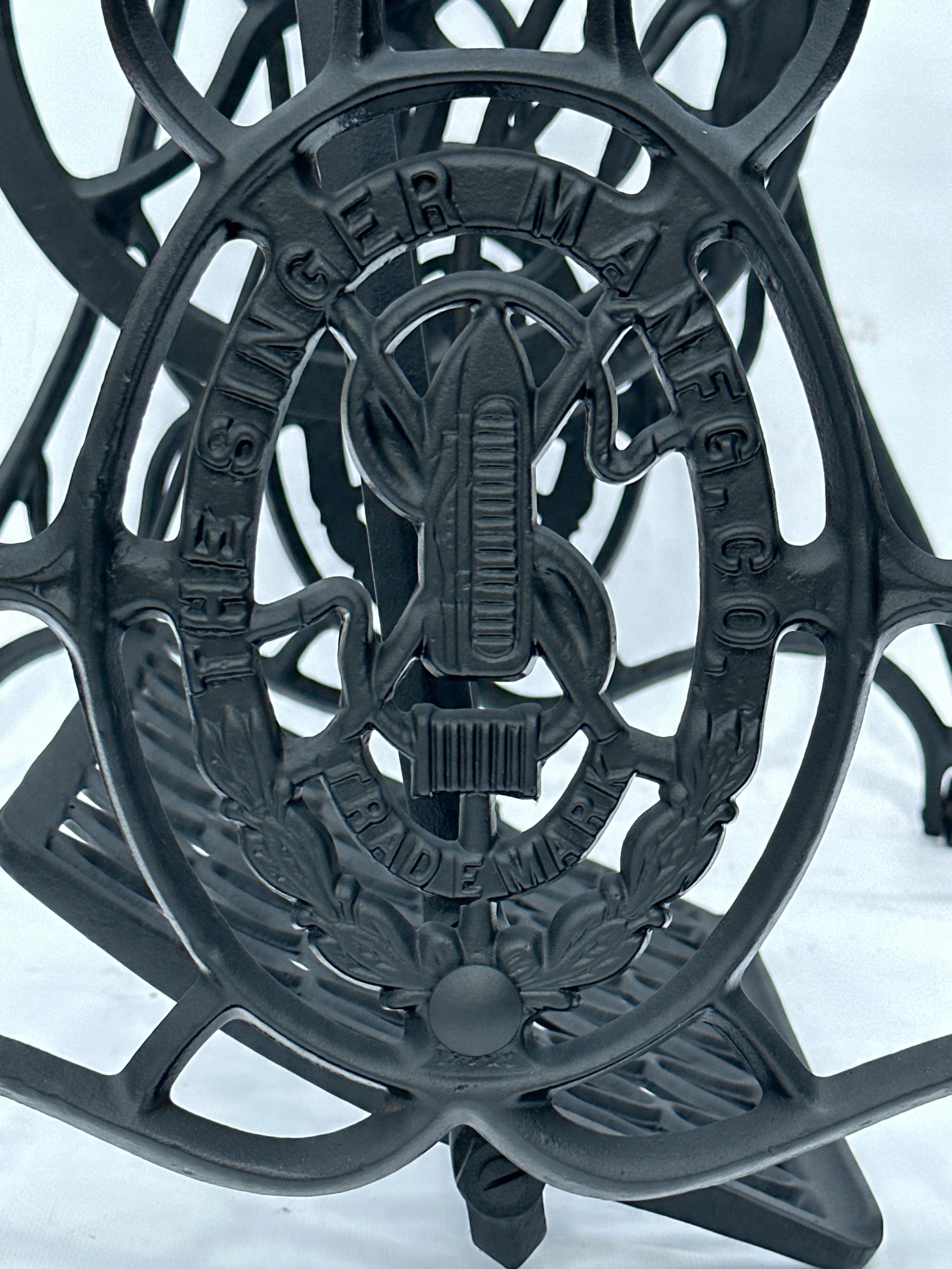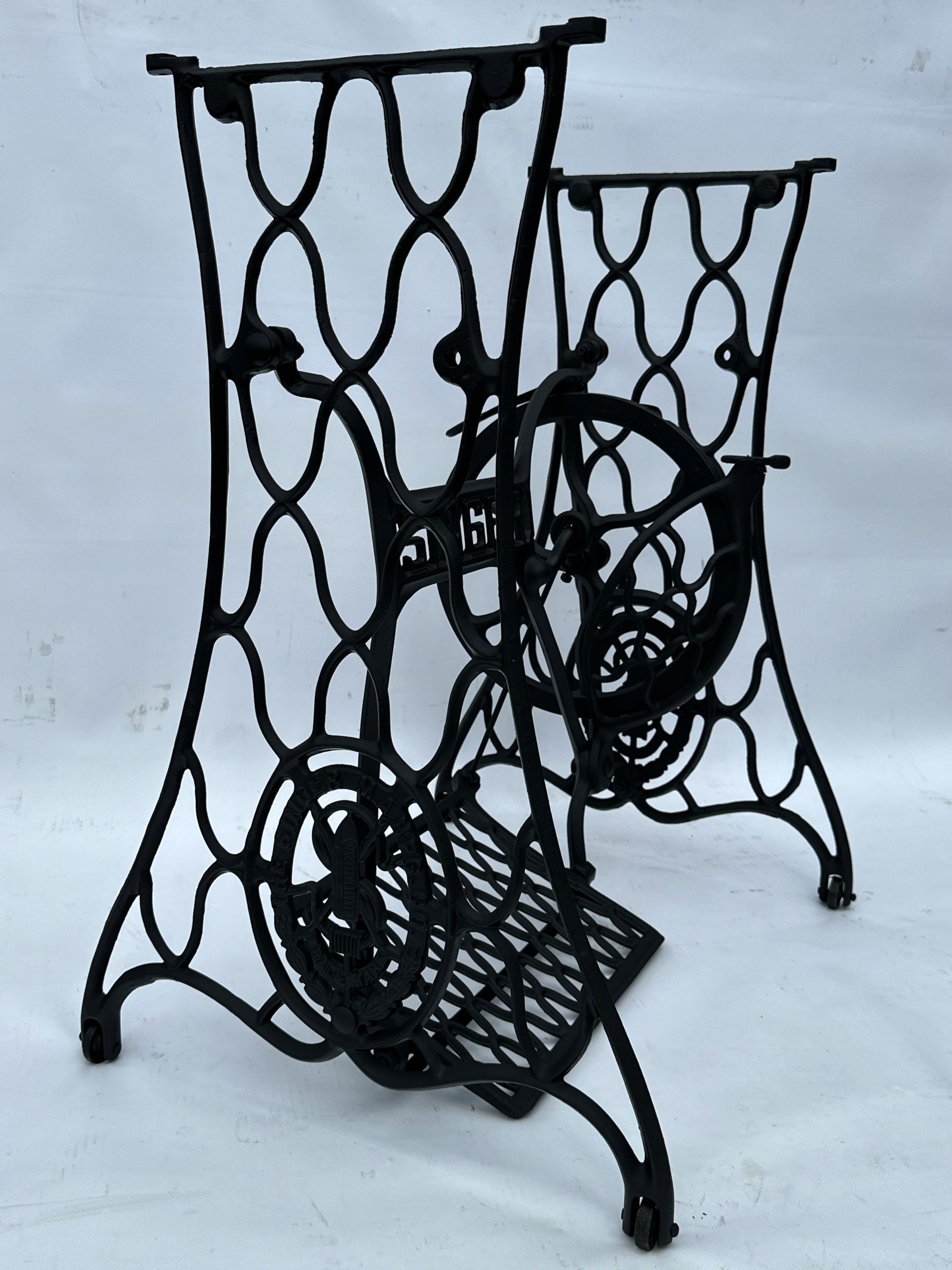 Предмет продажу стара чавунна основа від швейної машинки SINGER. Дуже гарний візерунок. З боків написи THE SINGER MANFG. ЩО. ТОРГОВА МАРКА. Має всі 4 колеса в нижній частині.Додатковою перевагою є металевий елемент, що з'єднує колесо з педаллю приводу, завдяки чому ми можемо бути впевнені, що його не з'їдять дровожери, які можливий в основах з дерев'яним елементом.
