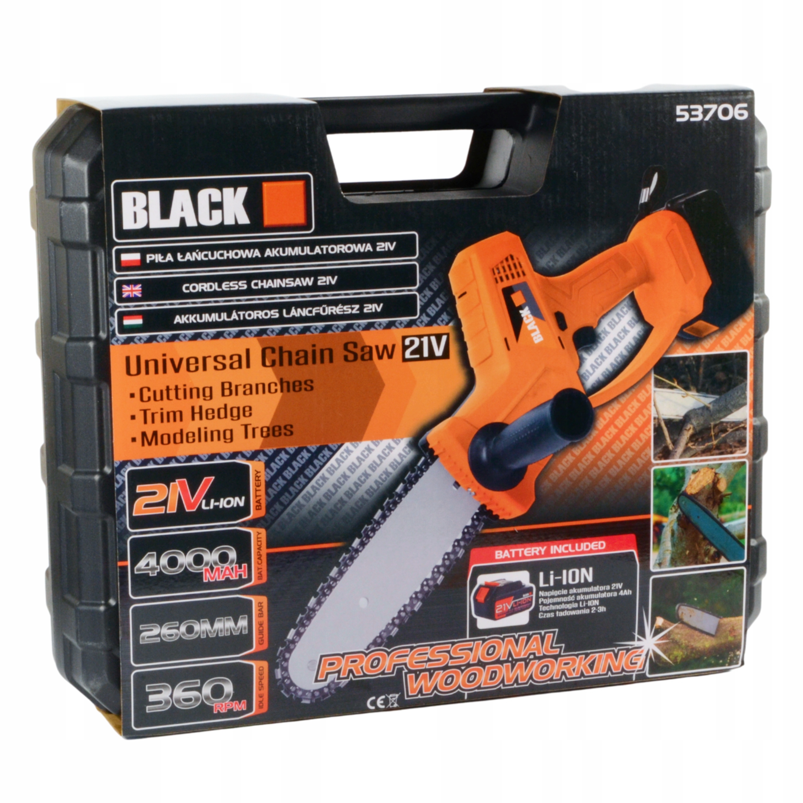 ЧОРНА міні-бензопила, що живиться від літій-іонного акумулятора з потужністю 21 В і ємністю 4 Ач (1 штука в комплекті!!) є новинкою на польському ринку. Бензопила оснащена містким акумулятором, що забезпечує тривалий час роботи, і шиною довжиною 26 см, що дозволяє зрізати навіть найтовстіші гілки та дахи. Це ідеальний інструмент для використання на відкритому повітрі, у саду, у саду та для будь-яких робіт на ділянці.