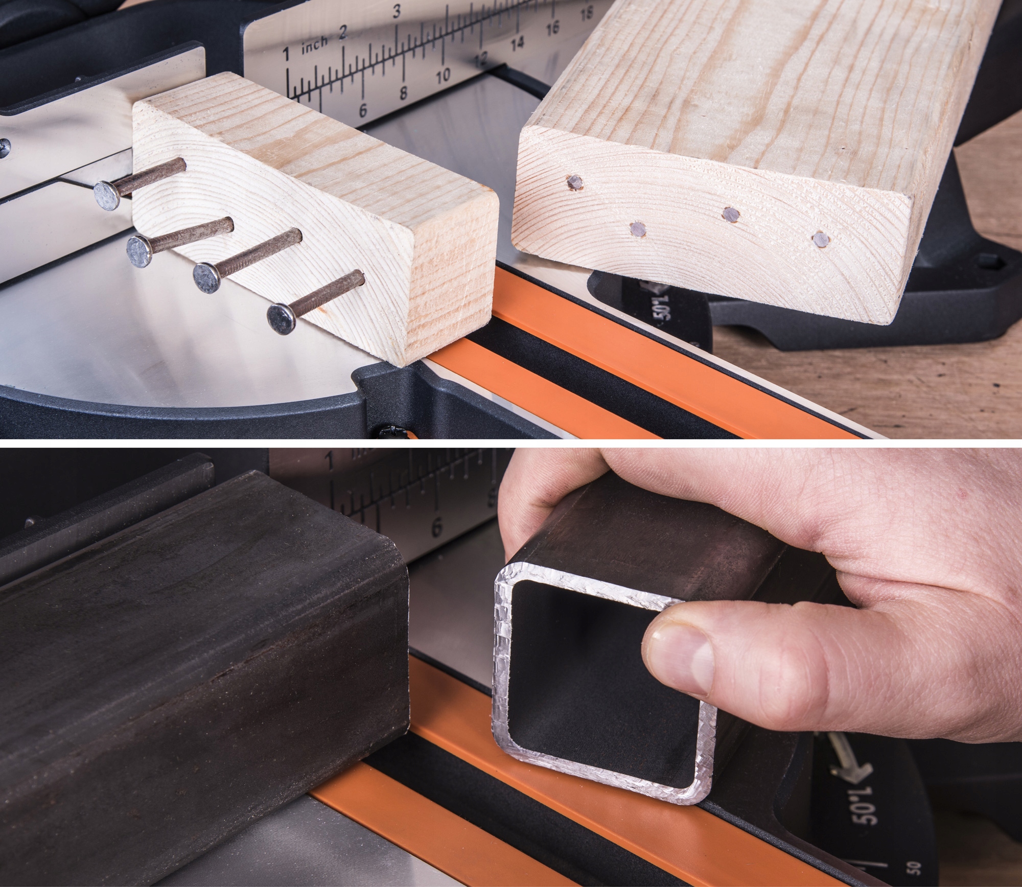 Під час різання переробленої деревини як торцювальна, так і диск не викликає проблем під час різання цвяхів, шурупів або скоб, розміщених усередині деревини.